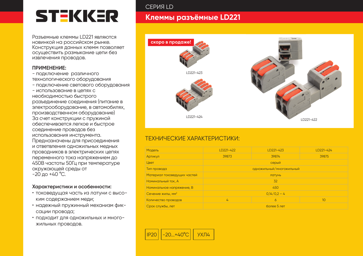 Клемма пружинная пружинная STEKKER LD221-422, 4-проводная 0,14/0,2 - 4мм, 450В, 32А, без пасты, материал изделия пластик, латунь. Тип провода одножильный/многожильный, материал провода медь, температура окружающей среды -20...+40°C