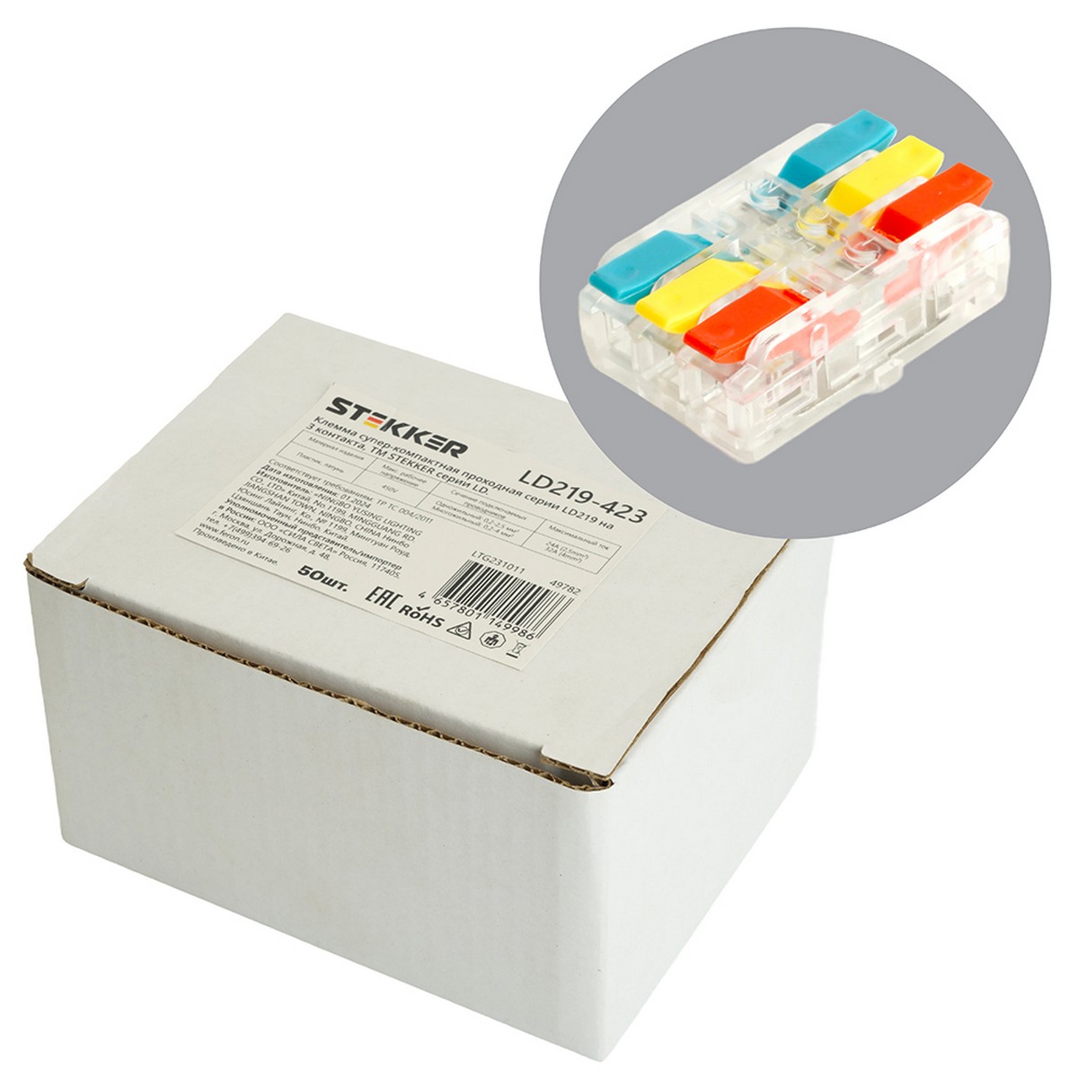 Клемма STEKKER LD219-423 супер-компактная проходная на 3 контакта 49782 по цене 30 руб. с фотографией и техническими характеристиками. Для покупки товара нажмите кнопку "Купить" и перейдите в корзину или позвоните по телефону 8 (495) 585 32 60 или 8 (800) 222 23 53.