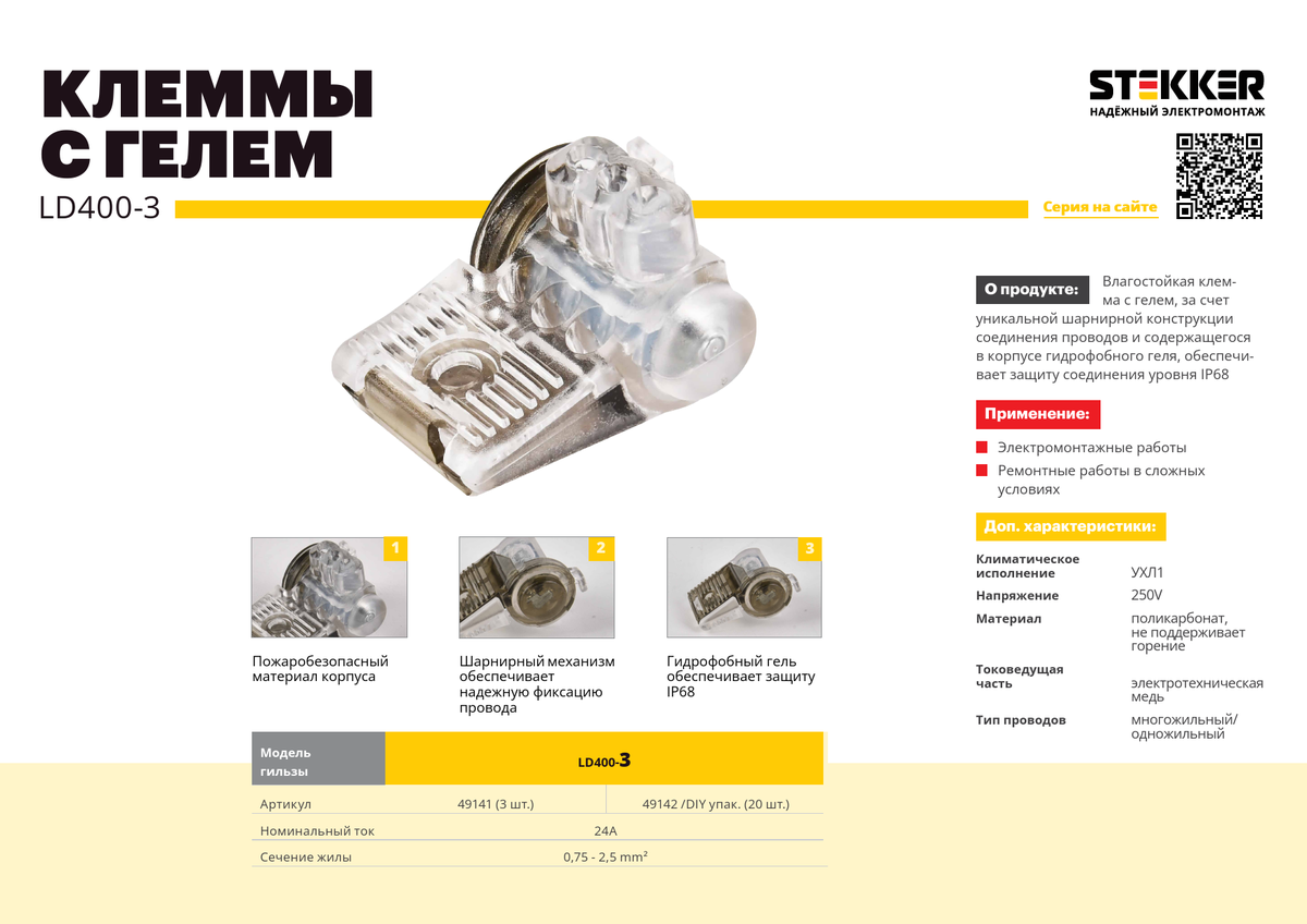 Клемма влагостойкая IP68 3-проводная STEKKER, с гелем, LD400-3 49141 по цене 123 руб. с фотографией и техническими характеристиками. Для покупки товара нажмите кнопку "Купить" и перейдите в корзину или позвоните по телефону 8 (495) 585 32 60 или 8 (800) 222 23 53.