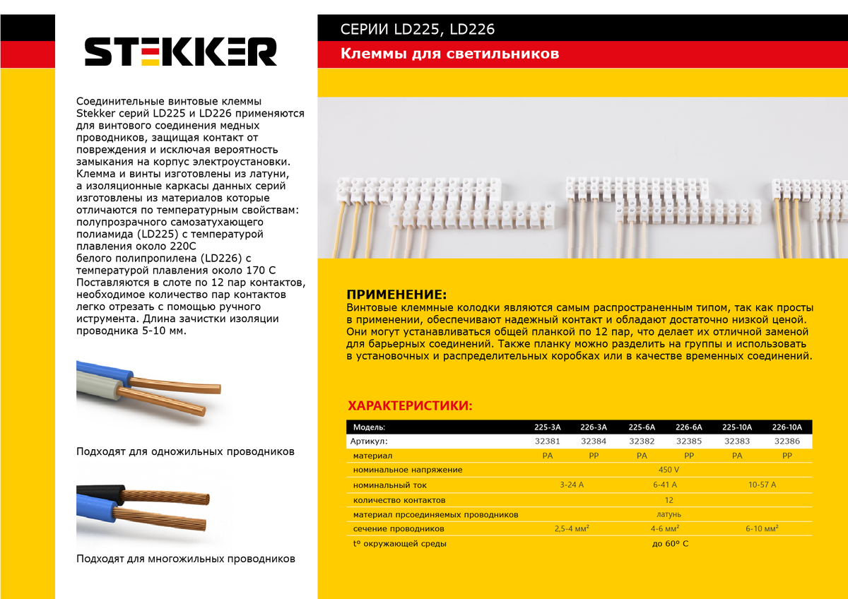 Клемма винтовая колодка STEKKER LD225-6A, 12-проводная 4 - 6 мм2, 450В, 6А, без пасты, материал изделия полиамид, латунь, сталь. Тип провода одножильный/многожильный, материал провода латунь/медь, температура окружающей среды -25...+125°C