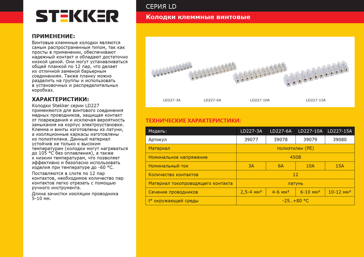 Клемма винтовая колодка STEKKER LD227-3A , 12-проводная 1,5 - 4 мм2, 450В, 3А, без пасты, материал изделия Полиэтилен. Тип провода одножильный/многожильный, материал провода латунь/медь, температура окружающей среды -25°C ..+80°C