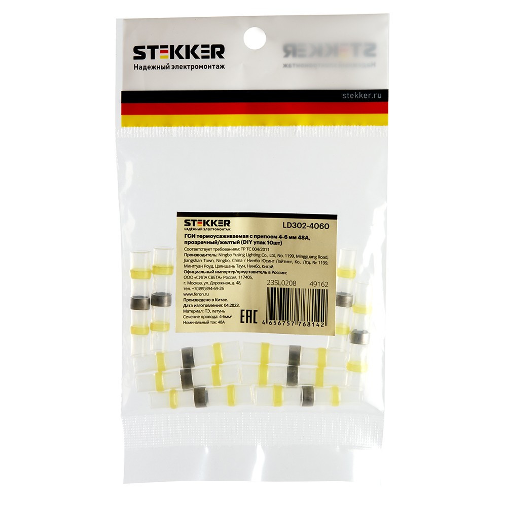 Термоусадочные коннекторы STEKKER LD302-40-60, длина 40мм. 10шт. в наборе, цвет: прозрачный,желтый. Коэффициент усадки 2:1, диапазон рабочих температур -10..+35°C, температура усадки +85..+125°C, номинальный ток 48А, для проводов сечением мм2.