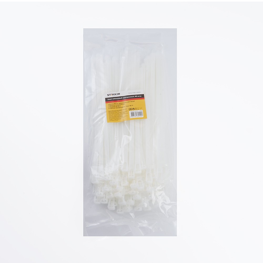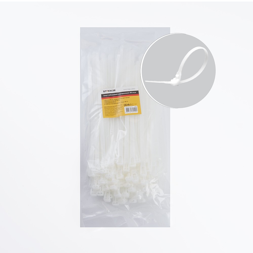 Хомут электромонтажный STEKKER NYCT80-250, Да, белый, материал - нейлон , максимальный диаметр пучка - 66мм, нагрузка - 55кг, диапазон рабочих температур -25°C - +80°C, рекомендуемая температура хранениня +5°C - +25°C
