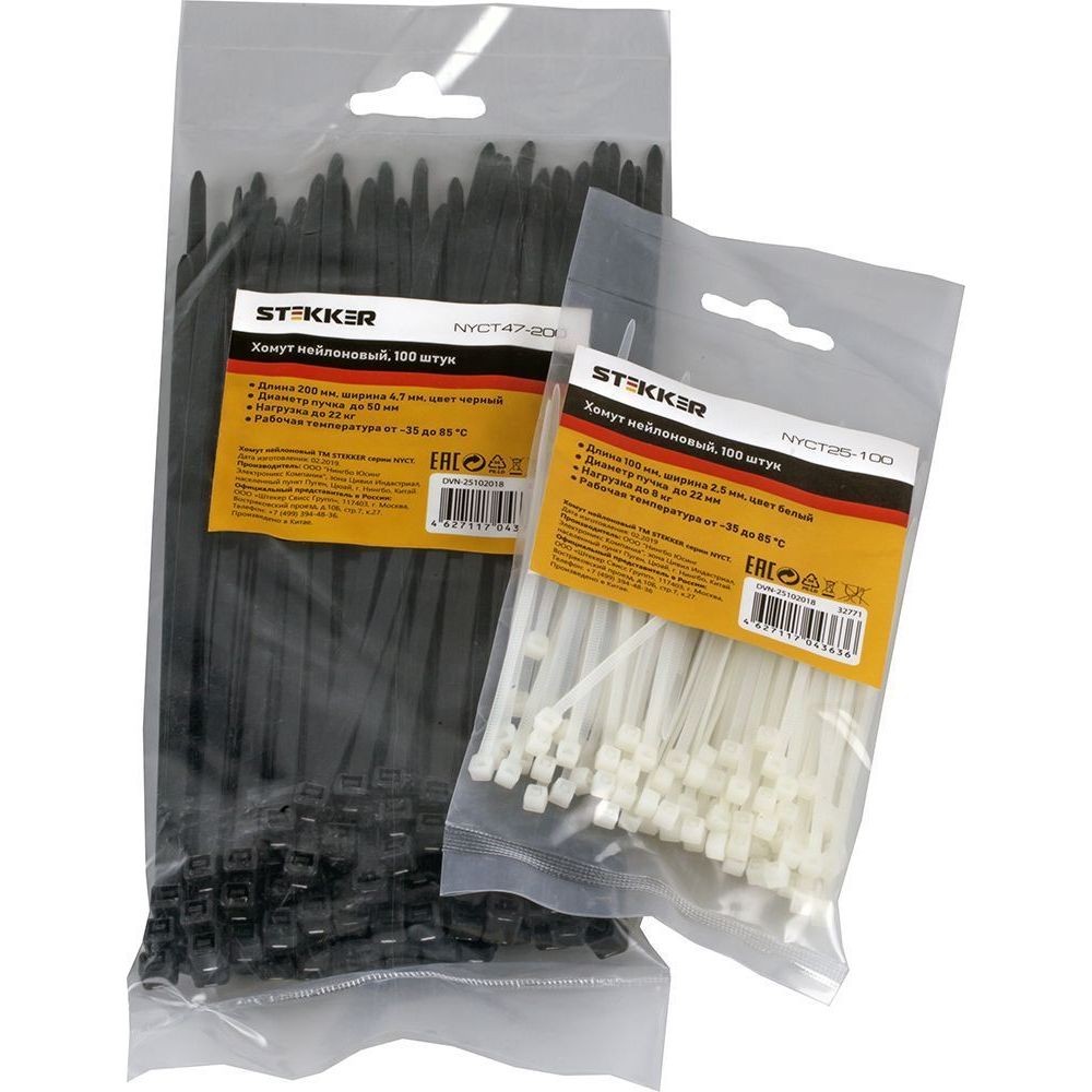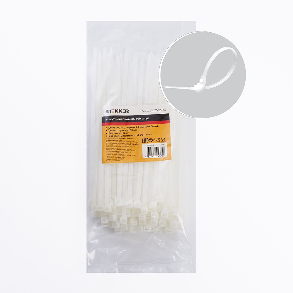 Хомут электромонтажный STEKKER NYCT47-200 , одноразовый, белый, материал - нейлон , максимальный диаметр пучка - 50мм, нагрузка - 22кг, диапазон рабочих температур -25°C - +85°C, рекомендуемая температура хранениня +5°C - +25°C