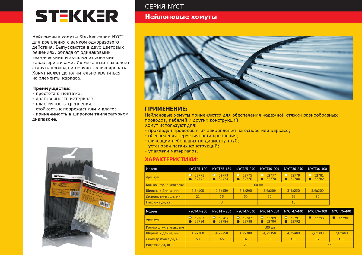 Хомут электромонтажный STEKKER NYCT47-350 , одноразовый, белый, материал - нейлон , максимальный диаметр пучка - 90мм, нагрузка - 22кг, диапазон рабочих температур -25°C - +85°C, рекомендуемая температура хранениня +5°C - +25°C