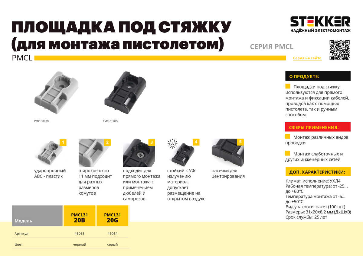 Площадка под хомут STEKKER PMCL3120B под пистолет, цвет черный, размер 31*20мм., материал: ударопрочный пластик. Максимальный размер хомута: 11мм., 100 шт в упаковке.