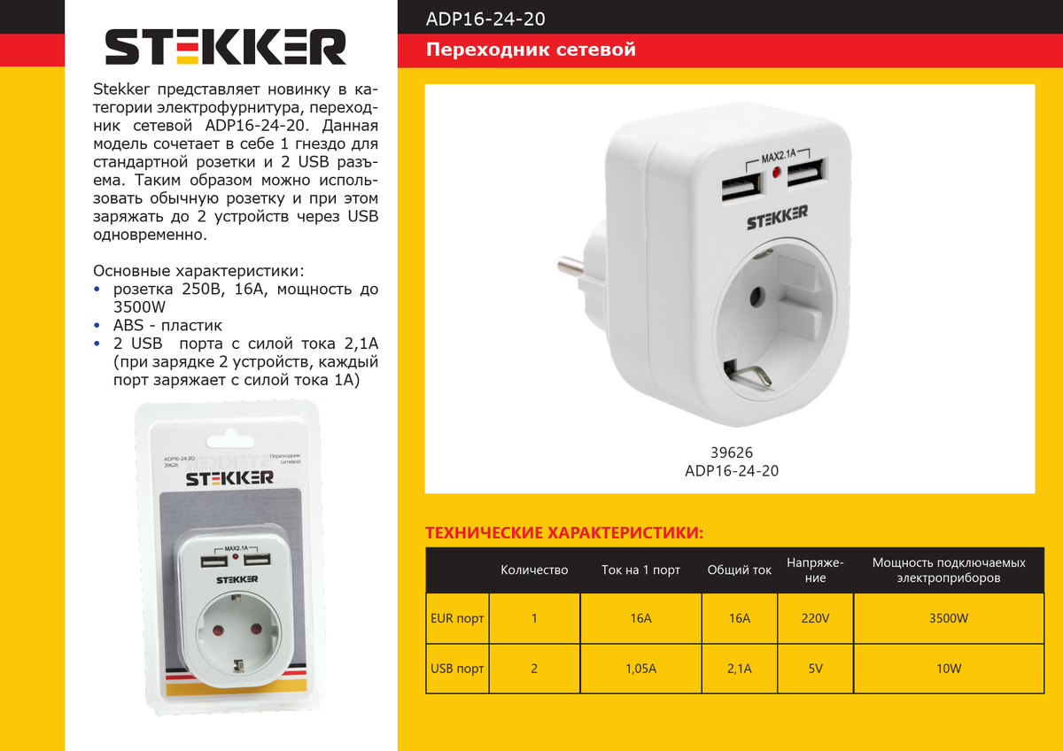 Переходник сетевой с/з c 2 USB 2,1А, STEKKER ADP16-24-20, 250В, 16A, IP20, белый 39626 по цене 327 руб. с фотографией и техническими характеристиками. Для покупки товара нажмите кнопку "Купить" и перейдите в корзину или позвоните по телефону 8 (495) 585 32 60 или 8 (800) 222 23 53.