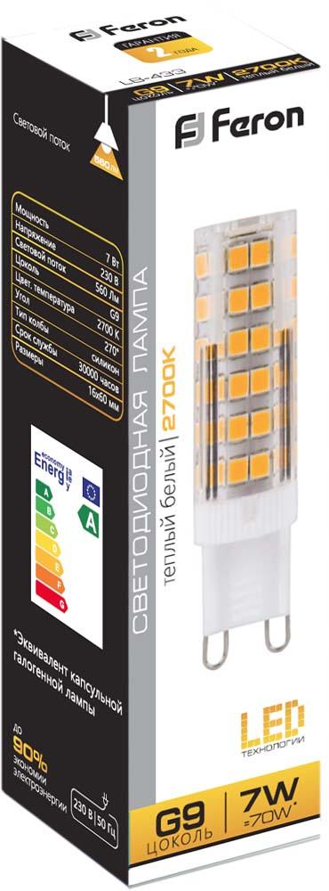 Лампа светодиодная Feron LB-433 G9 7W 2700K 25766 по цене 131 руб. с фотографией и техническими характеристиками. Для покупки товара нажмите кнопку "Купить" и перейдите в корзину или позвоните по телефону 8 (495) 585 32 60 или 8 (800) 222 23 53.