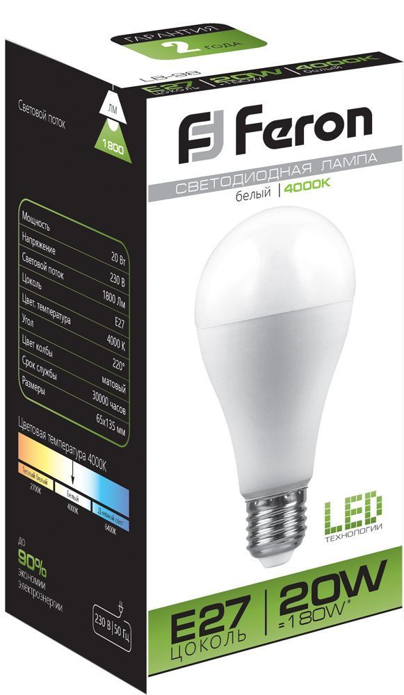 Лампа светодиодная Feron LB-98 E27 20W 4000K предназначена для создания комфортного освещения. Обладает мощностью 20 Вт и световым потоком 1800 Лм. Цветовая температура 4000K обеспечивает нейтральный белый свет, идеальный для офисов и жилых помещений. Угол рассеивания 220° гарантирует равномерное распределение света. Матовый белый рассеиватель снижает яркость и создает приятную атмосферу. Лампа имеет стандартный цоколь E27 и подходит для напряжения 230V. Компактные размеры 120*65 мм делают её универсальной для различных осветительных приборов.