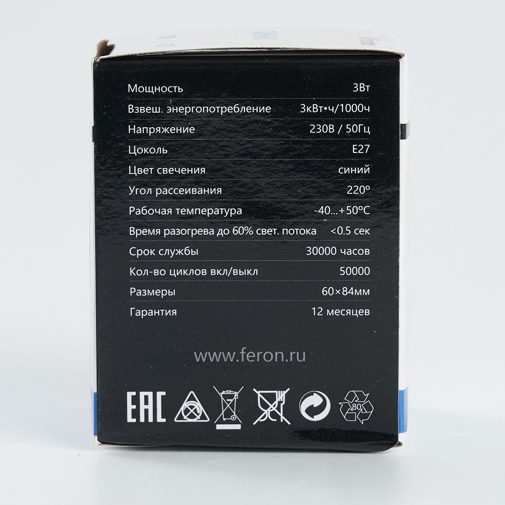 Лампа светодиодная Feron LB-371 E27 3W синяя 25906 по цене 82 руб. с фотографией и техническими характеристиками. Для покупки товара нажмите кнопку "Купить" и перейдите в корзину или позвоните по телефону 8 (495) 585 32 60 или 8 (800) 222 23 53.