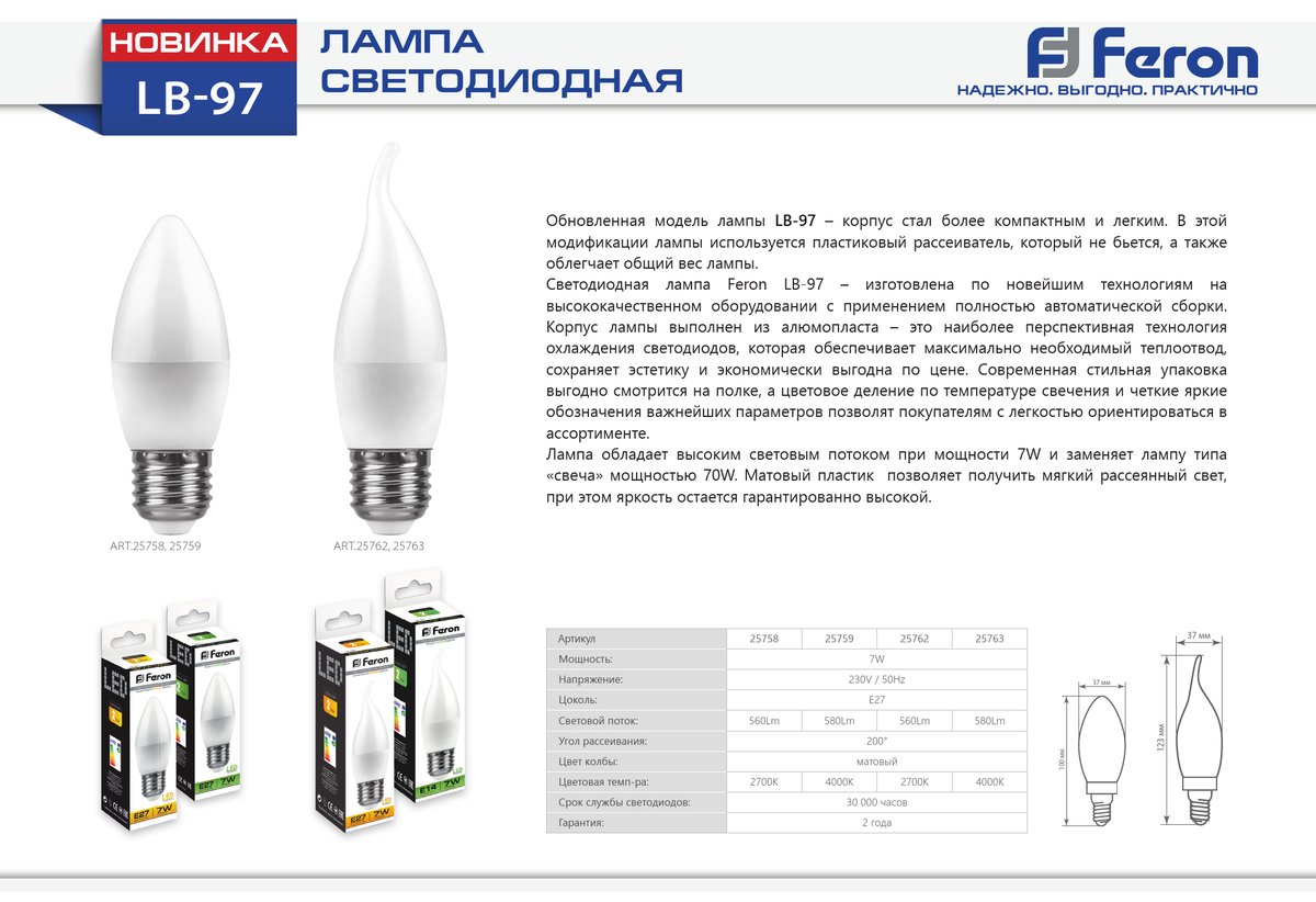 Лампа светодиодная Feron LB-97 Свеча E27 7W 4000K 25759 по цене 67 руб. с фотографией и техническими характеристиками. Для покупки товара нажмите кнопку "Купить" и перейдите в корзину или позвоните по телефону 8 (495) 585 32 60 или 8 (800) 222 23 53.