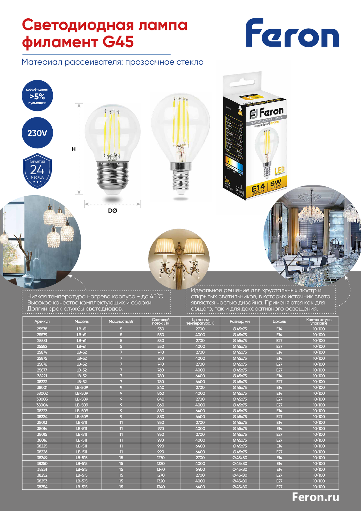 Лампа светодиодная Feron LB-515 (артикул 38249) сочетает стильный дизайн и высокую эффективность. С мощностью 15W и цветовой температурой 2700K она обеспечивает теплый свет, создавая уютную атмосферу. Прозрачный рассеиватель и угол рассеивания 270° гарантируют равномерное освещение. Компактный размер (80*45 мм) и цоколь E14 делают установку простой и удобной. Идеальный выбор для домашнего и офисного освещения.