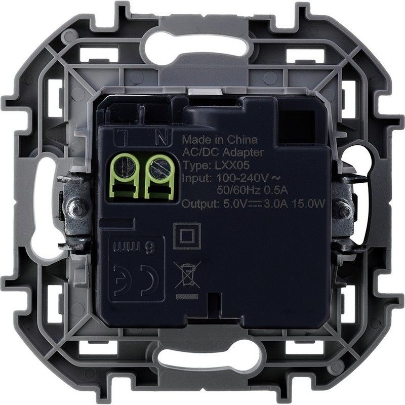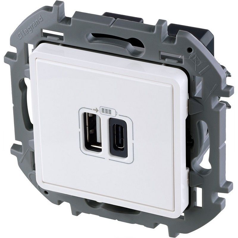 Зарядное устройство Legrand Inspiria для скрытого монтажа , тип А-тип С, цвет "Белый". Напряжение ~240В/=5В, максимальный зарядный ток 3000 мА.