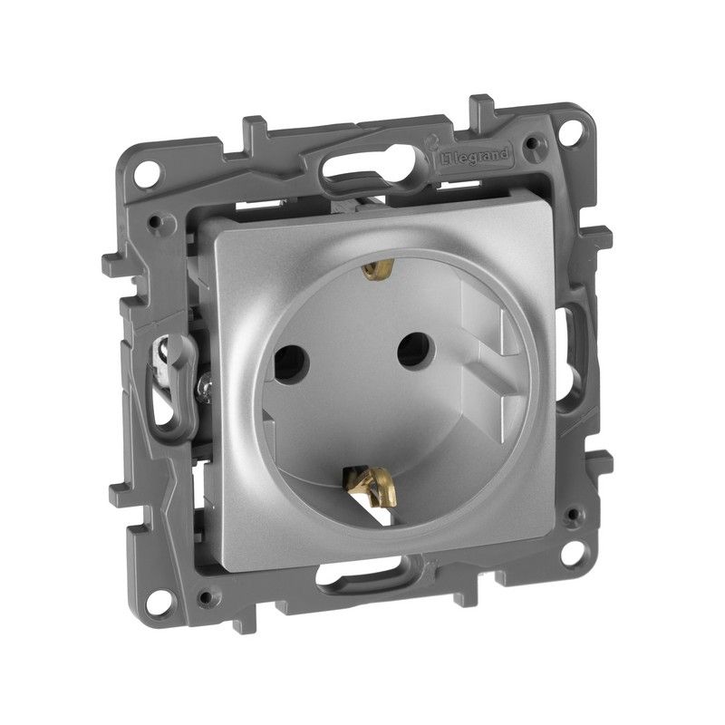 Розетка с заземлением Legrand Etika для скрытого монтажа, цвет алюминий. Максимальный ток 16 А, максимальная мощность 3680 Вт. Применяется в зданиях, оборудованных для повышения безопасности проводкой с заземлением (с защитным проводником).Особенности:- Контактная группа изготовлена из латуни CuZn37, имеет высокую степень упругости и сохраняет плотный контакт с вилкой, при длительной эксплуатации.- Скоба заземления имеет особый профиль для большей прочности. - Лицевая панель крепится на защелках. Изготовлена из прочного глянцевого поликарбоната, стойкого к механическим воздействиям, выгоранию и загрязнениям.- Зажимы для присоединения проводников винтовые. - Все токоведущие части розетки имеют защиту от случайного прикосновения. - Острые крепёжные лапки с широким углом раскрытия, обеспечивают надёжную фиксацию в монтажной коробке. Особенности серии Etika:- Корпус механизма- высококачественный поликарбонат, не проводит электрический ток, не поддерживает горение. - Специальный профиль внешнего контура механизма обеспечивает простоту и безошибочность многопостового монтажа. - Острые крепёжные лапки с широким углом раскрытия, обеспечивают надёжную фиксацию в монтажной коробке