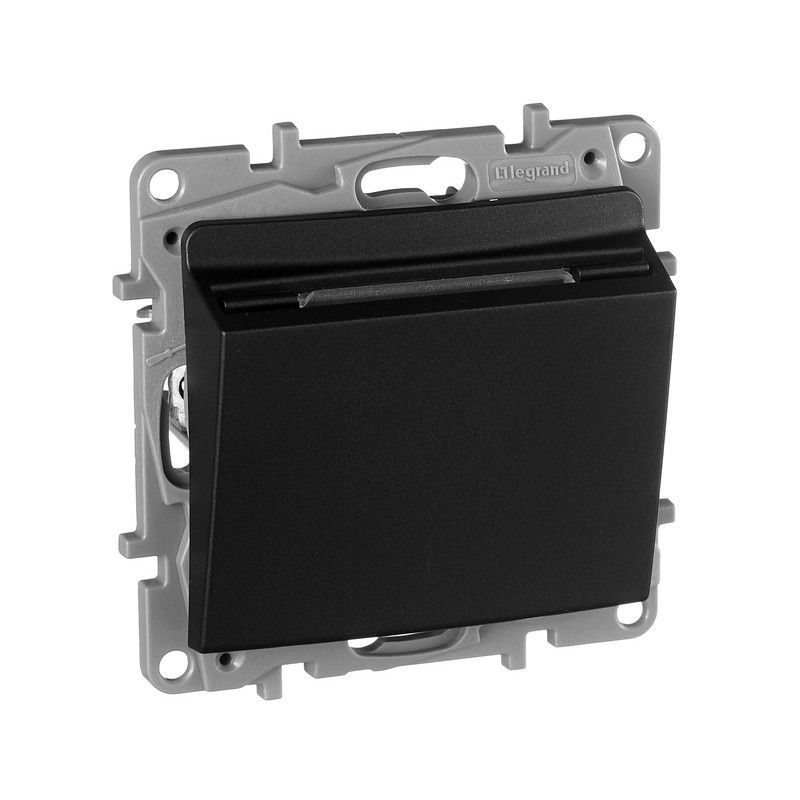 Выключатель для гостиничных номеров с выдержкой времени и подсветкой в цвете антрацит Legrand Etika. Совместимость с картой для гостиничного номера макс. шириной 54 мм Выдержка времени около 30 с после извлечения карты
