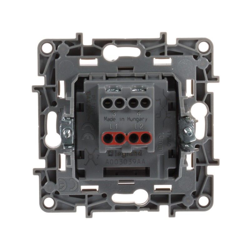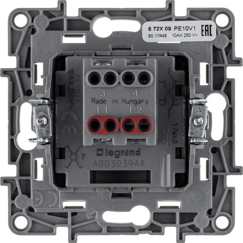 Преимущества этого переключателя включают короткий и тихий ход клавиши, защиту токоведущих частей от случайного прикосновения и безвинтовые зажимы для подключения проводов, что упрощает установку. Специальный профиль механизма обеспечивает простоту многопостового монтажа, а острые крепёжные лапки гарантируют надёжное фиксирование в коробке. Выбирайте Legrand Etika для надёжного и эстетичного решения в области электрической установки.