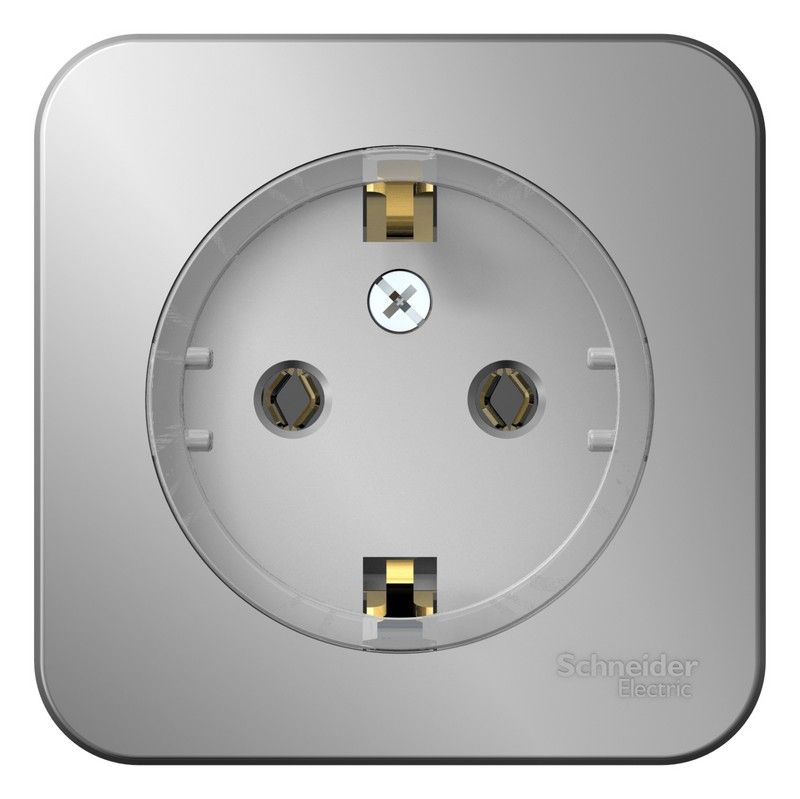 Механизм с быстрозажимными клеммами Systeme Electric серии ArtGallery в цвете алюминий розетки одинарной с заземлением и без шторок подходит для сетей 250 В, на ток 16 А.
