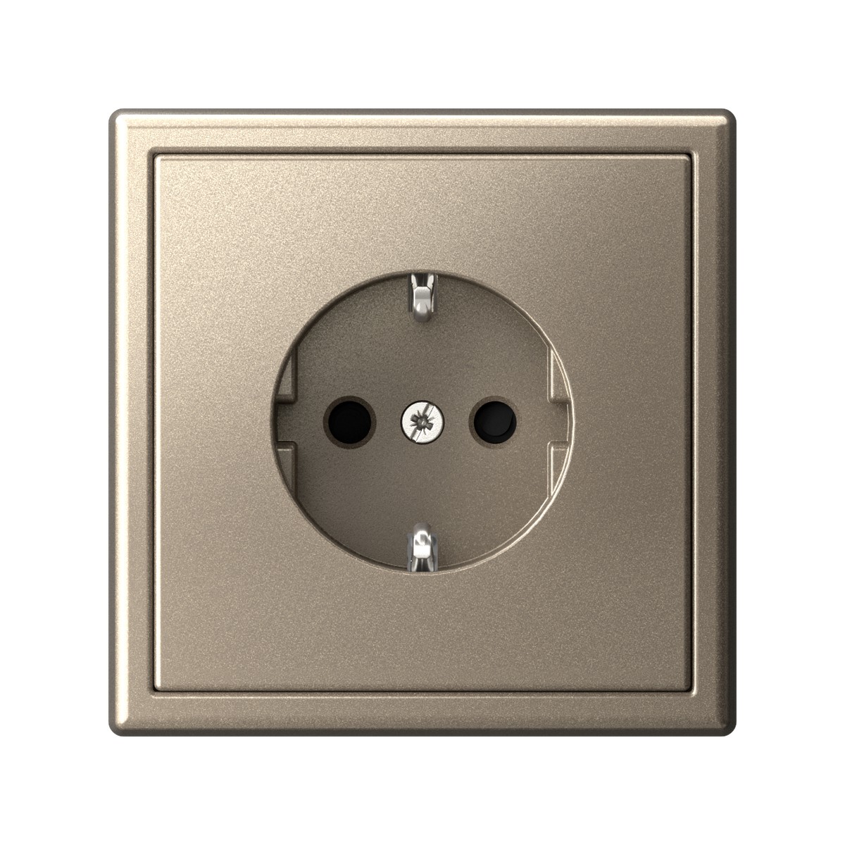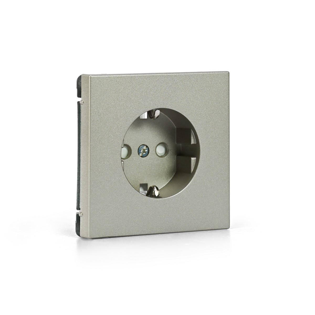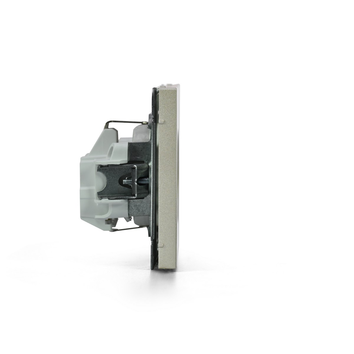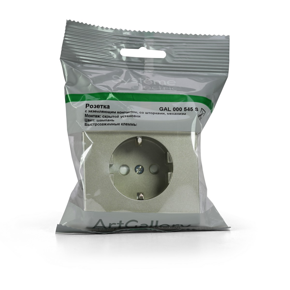 Механизм с быстрозажимными клеммами Systeme Electric серии ArtGallery в цвете шампань розетки одинарной с заземлением и шторками подходит для сетей 250 В, на ток 16 А.
