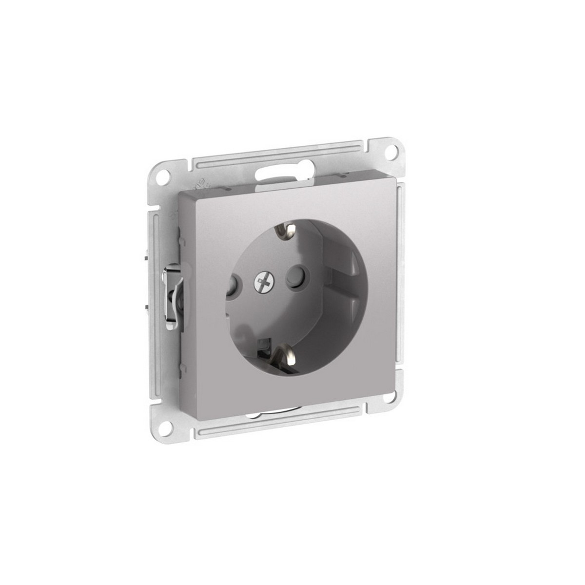 Механизм с быстрозажимными клеммами Systeme Electric (ранее Schneider Electric) серии AtlasDesign в цвете алюминий розетки одинарной с заземлением и со штороками подходит для сетей 250 В, на ток 16 А. С помощью новых быстрозажимных клемм монтаж розеток и выключателей стал намного быстрее. Теперь подключение не требует использования отвертки.