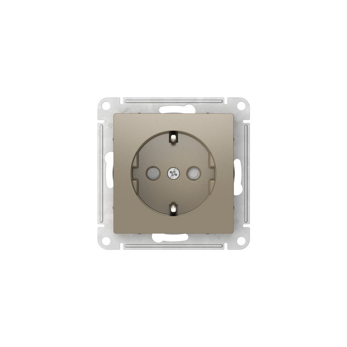 Механизм с быстрозажимными клеммами Systeme Electric (ранее Schneider Electric) серии AtlasDesign в цвете шампань розетки одинарной с заземлением и со штороками подходит для сетей 250 В, на ток 16 А. С помощью новых быстрозажимных клемм монтаж розеток и выключателей стал намного быстрее. Теперь подключение не требует использования отвертки.