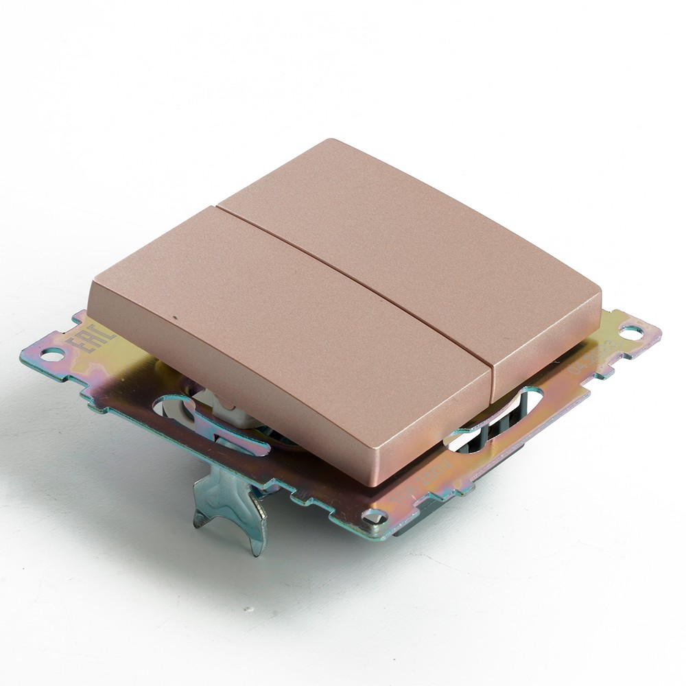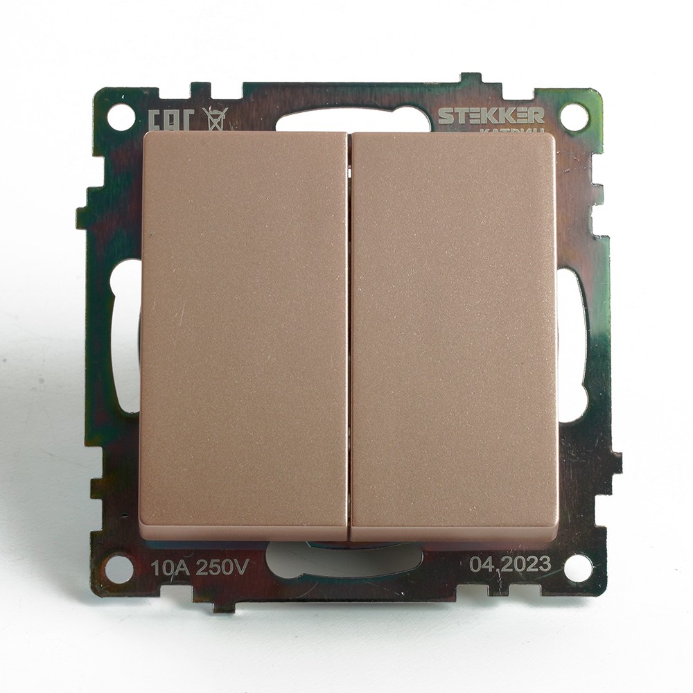 Переключатель двухклавишный STEKKER GLS10-7107-02 из серии Катрин – идеальное решение для комфортного управления освещением в вашем доме. Скрытый тип установки обеспечивает аккуратный внешний вид, а размеры 55*55*35 мм позволяют легко вписать его в любой интерьер. Изготавливается из высококачественного поликарбоната и латуни, что гарантирует надежность и долгий срок службы. Цвет шампань добавляет элегантности и стиля. Номинальное напряжение 250 В и ток 10 А обеспечивают стабильную работу. Степень защиты IP20 делает его подходящим для использования в помещениях. С этим переключателем вы получите не только удобство, но и эстетическое удовольствие.