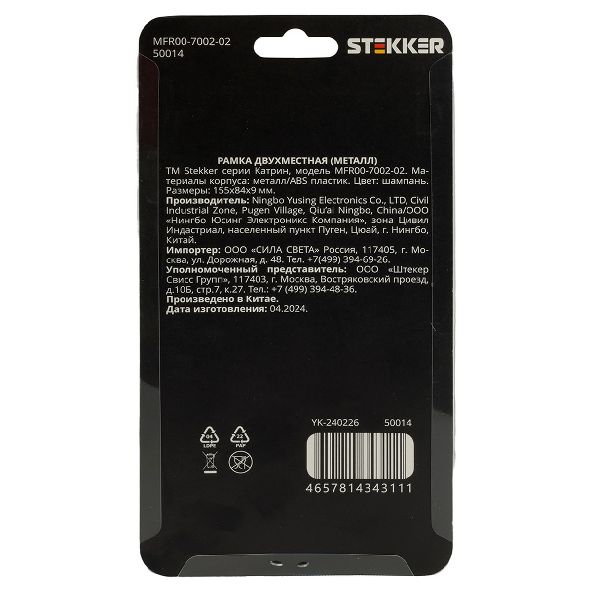 Рамка 2-местная металл STEKKER MFR00-7002-02 Катрин в цвете шампань – это идеальное решение для создания стильного и современного интерьера. Изготовленная из прочного металла и ABS пластика, она гарантирует долговечность и надежность. Размеры 155*84*9 мм позволяют легко интегрировать рамку в любые стандартные монтажные системы.