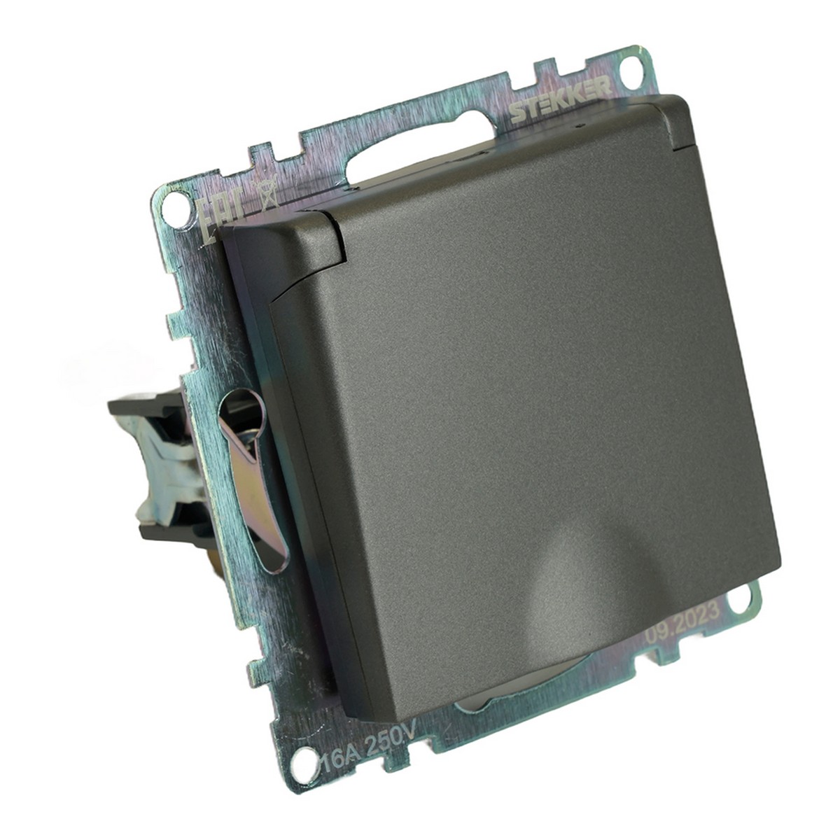 Розетка 1-местная с заземлением и крышкой STEKKER GLS16-7112-04, 16А, серия Катрин, графит. Обеспечивает безопасное подключение электроприборов благодаря защите шторкой. Идеальна для использования в жилых и офисных помещениях, гармонично вписывается в современный интерьер.