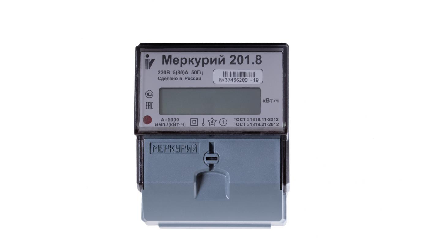 Счётчик электроэнергии однофазный Меркурий 201.8 однотарифный 60A по цене 2 129 руб. с фотографией и техническими характеристиками. Для покупки товара нажмите кнопку "Купить" и перейдите в корзину или позвоните по телефону 8 (495) 585 32 60 или 8 (800) 222 23 53.