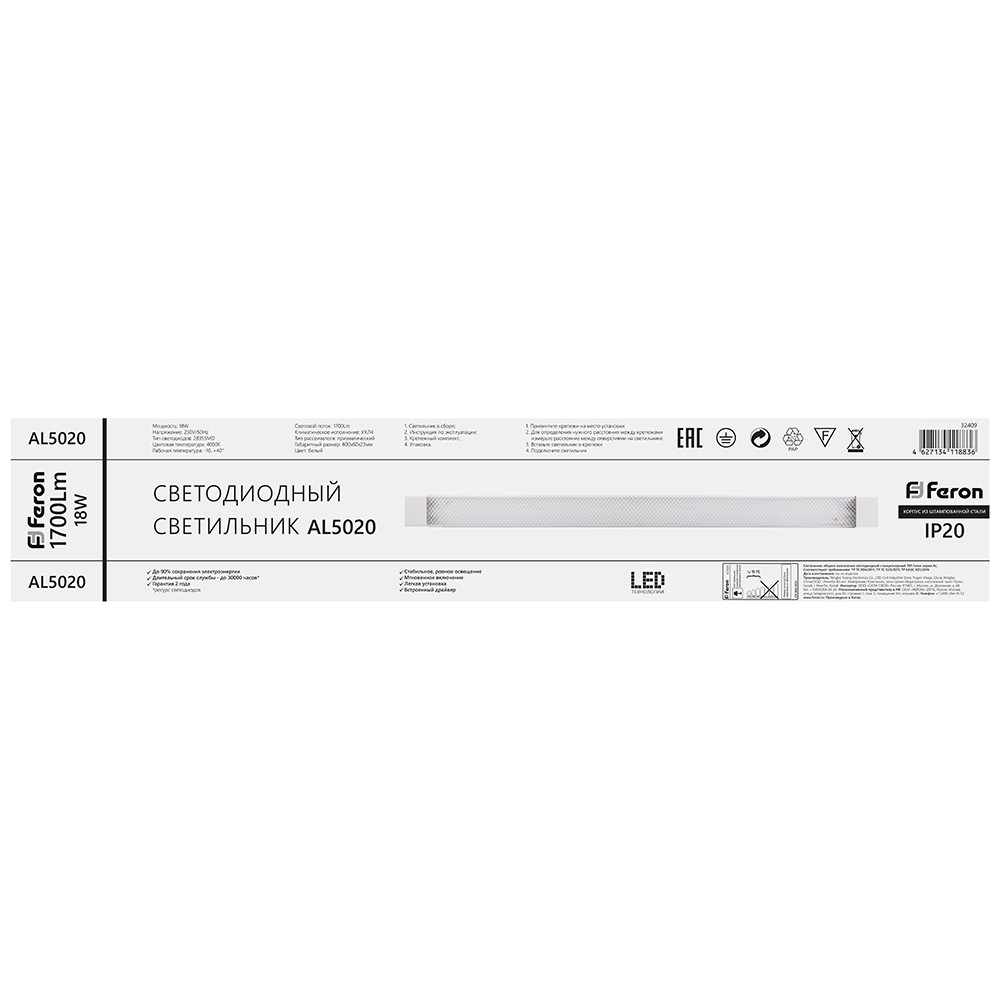 Светодиодный накладной светильник ТМ Feron AL5020 артикул 32409 – это бюджетная модель для внутреннего освещения жилых и общественных помещений: офисов, торговых залов, подсобных помещений, коридоров, лестничных пролетов и пр.
