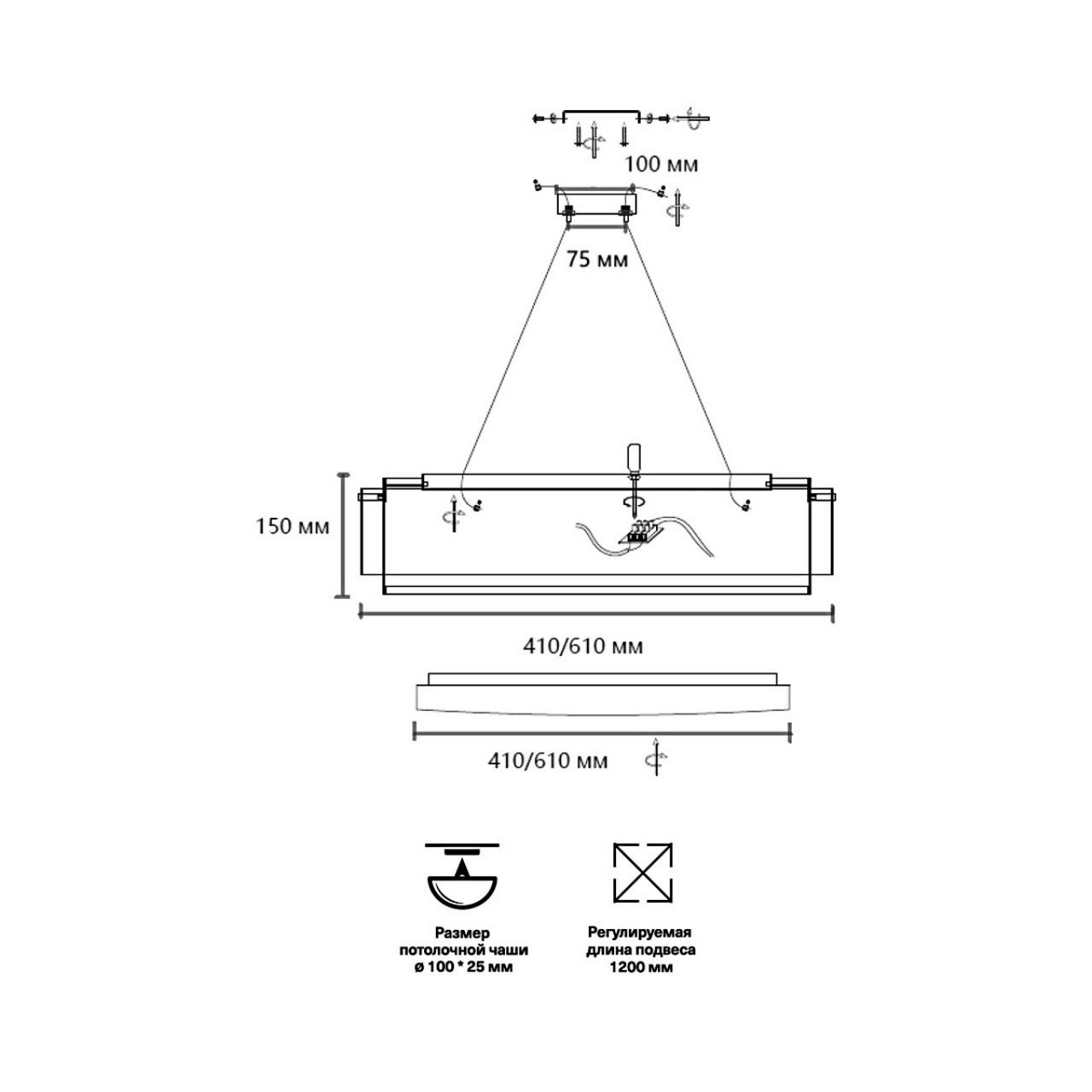 Тросы подвесного крепление для модели ANTEY выполнены из металла в приятной на ощупь силиконовой оплетке. Питающий провод и потолочная чаша выполнены в цвете внешнего контура корпуса светильника - угольно-черном.