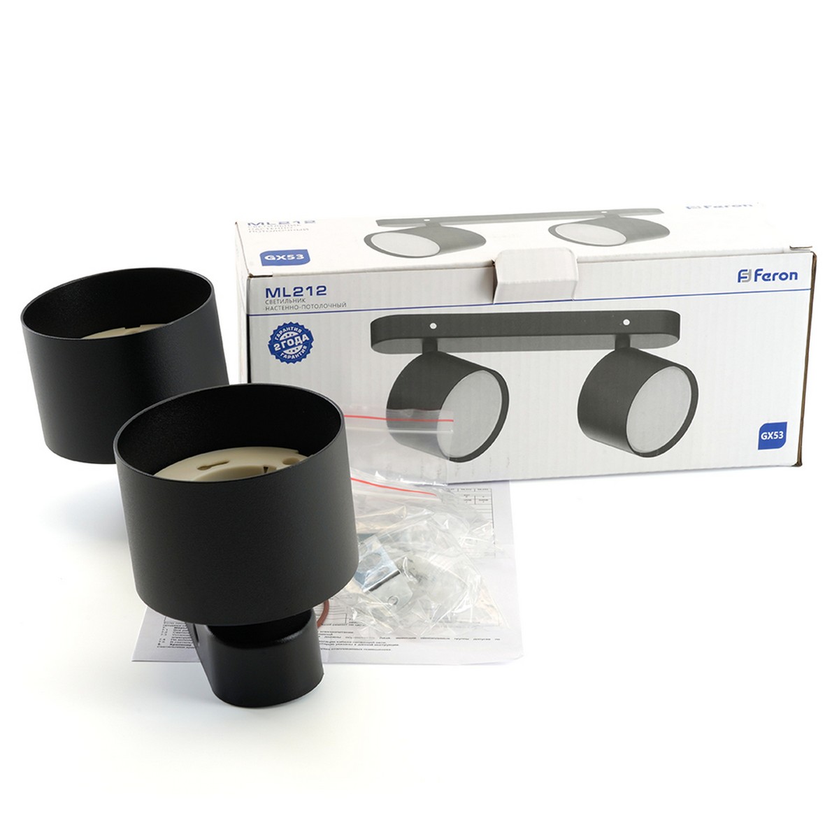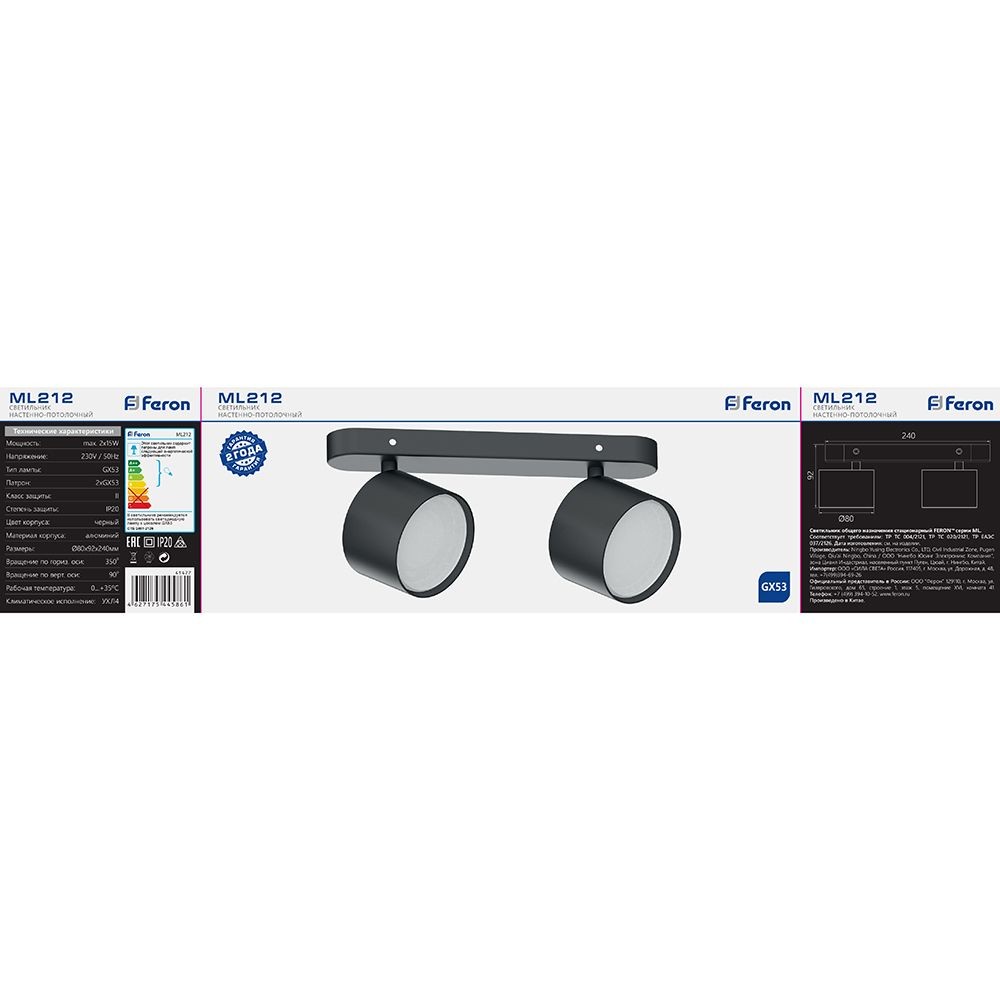 Современный светильник спот создаст уютное освещение в любом интерьере. Можно использовать как основное или акцентное освещение в любом помещении. Модель ML212 от производителя Feron в цвете Черный и типом лампы GX53 которая обеспечивает мощность 15 Ватт обеспечит Вас качественным светом. А универсальный крепеж (в комплекте) позволяет установить светильник на любую поверхность. Светильник накладной под лампу, (ИВО) FERON ML212, 2*GX53 2*15 W, 230V, IP20, цвет черный, корпус алюминий, 240*80*92