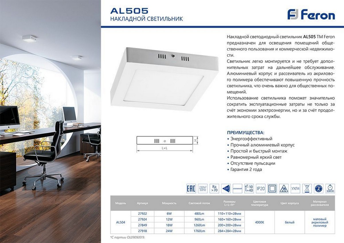Накладной светодиодный светильник AL505 TM Feron артикул 27922 предназначен для освещения помещений общественного пользования и коммерческой недвижимости.
