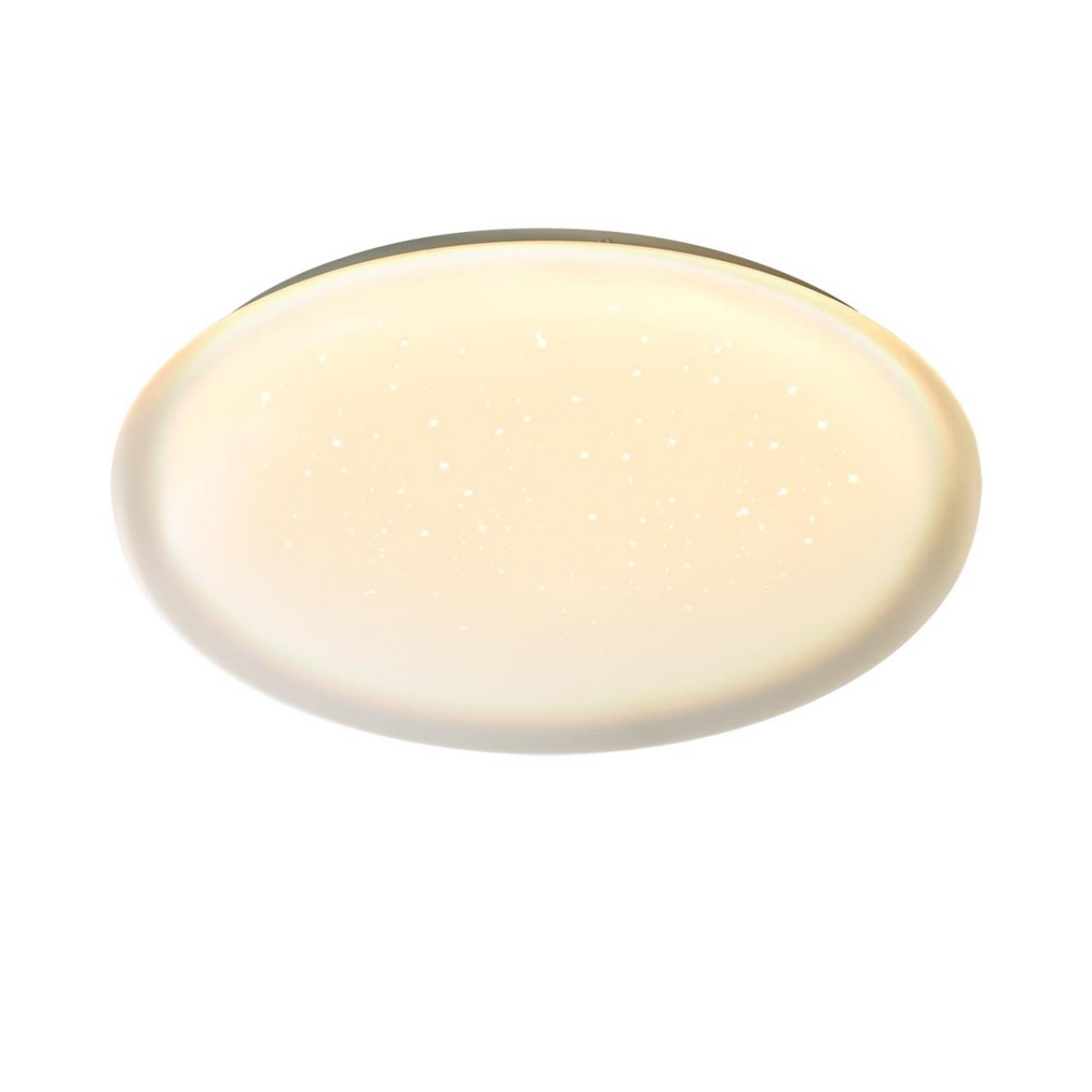 Светильник 7774/ELN линии JOLLY состоит из металлического основания (базы) и пластикового рассеивателя. Материал рассеивателя - высококачественный акрил белого цвета с глянцевой поверхностью, обеспечивающий светильнику равномерное рассеивание и хорошее светопропускание. Форма плафона: круглая, декорирована прозрачными точками, придающими включенному светильнику красивый эффект "звездного мерцания" и переливания. Степень защиты IP43 позволяет использовать светильник в определенных зонах влажных помещений. В комплект входит LED модуль с линзами, мощностью 76Вт, которая соответствует лампе накаливания 740Вт. А также переключатель температуры цвета (ССT) на драйвере, с помощью которого осуществляется изменение цветовой температуры 3000/4000/6000К и переход светильника в режим теплого/белого/холодного света. Для установки необходимого режима рекомендуется использовать удлиненный тонкий предмет типа небольшой отвертки.
