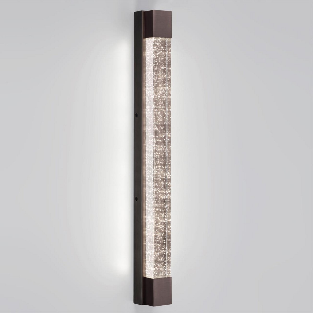 В линии Mirada используются в качестве рассеивателя прямоугольные слитки хрусталя с эффектом пузырьков, основание выполнено в двух цветах: латунь и черный брашированный. Свет светодиодов дает роскошное рассеивание в хрустале и обеспечивает игру света в пузырьках. Светильник представлен в цвете античная бронза и темная брашированная латунь.