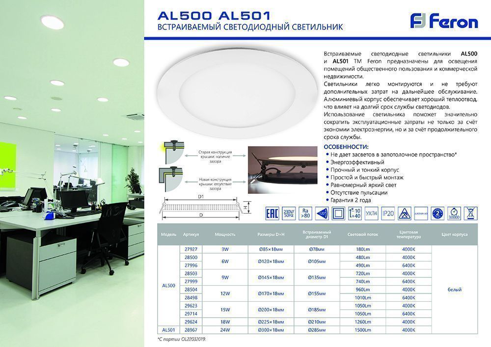 Встраиваемые светодиодные светильники AL500 TM Feron артикул 29714 предназначены для освещения помещений общественного пользования и коммерческой недвижимости.