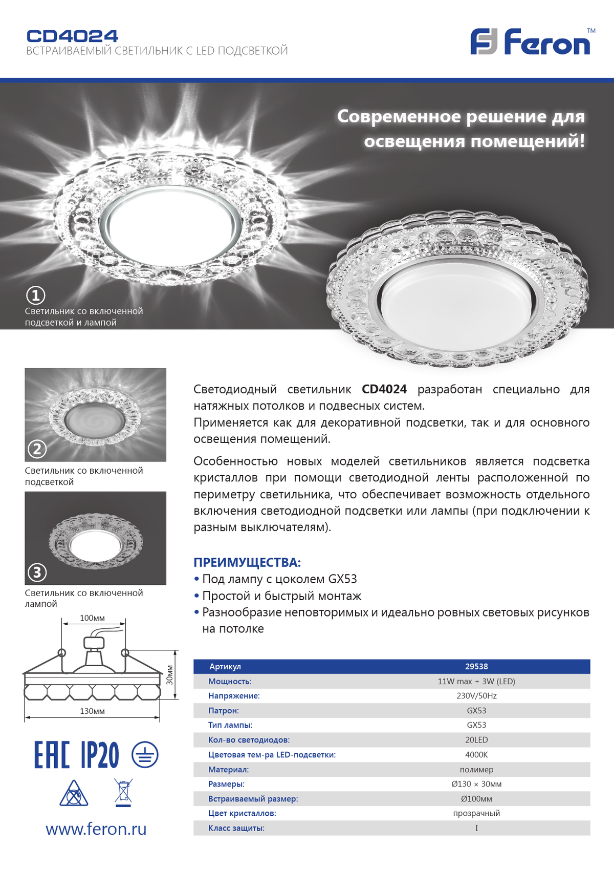 Светильник встраиваемый Feron CD4024 с белой LED подсветкой GX53 прозрачный 29538 по цене 305 руб. с фотографией и техническими характеристиками. Для покупки товара нажмите кнопку "Купить" и перейдите в корзину или позвоните по телефону 8 (495) 585 32 60 или 8 (800) 222 23 53.