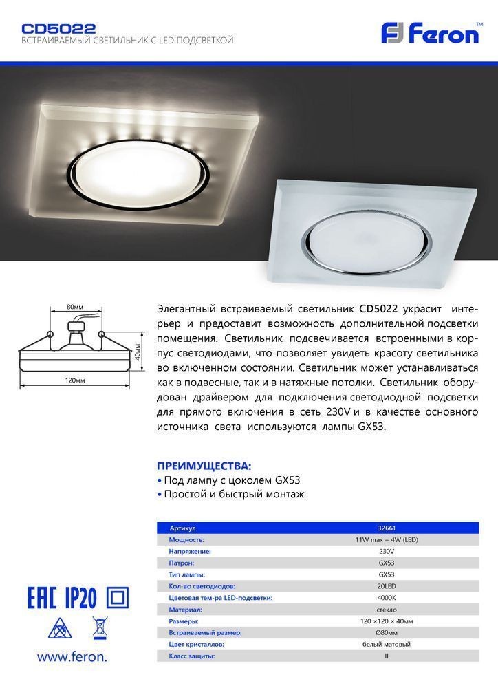 Светильник встраиваемый Feron CD5022 с белой LED подсветкой GX53 белый матовый квадрат 32661 по цене 303 руб. с фотографией и техническими характеристиками. Для покупки товара нажмите кнопку "Купить" и перейдите в корзину или позвоните по телефону 8 (495) 585 32 60 или 8 (800) 222 23 53.