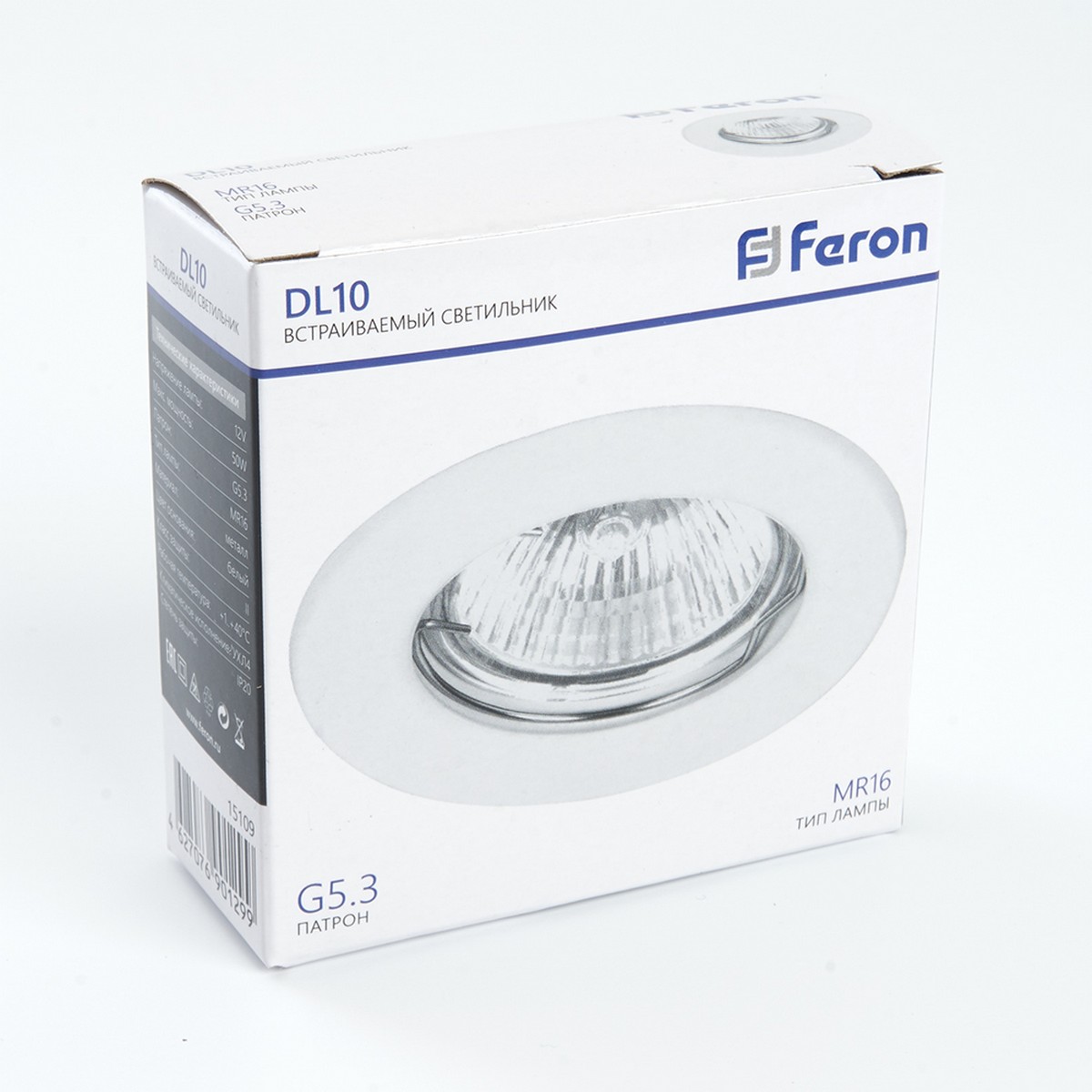 Светильник встраиваемый Feron DL10 потолочный белый MR16 G5.3 15109 по цене 61 руб. с фотографией и техническими характеристиками. Для покупки товара нажмите кнопку "Купить" и перейдите в корзину или позвоните по телефону 8 (495) 585 32 60 или 8 (800) 222 23 53.