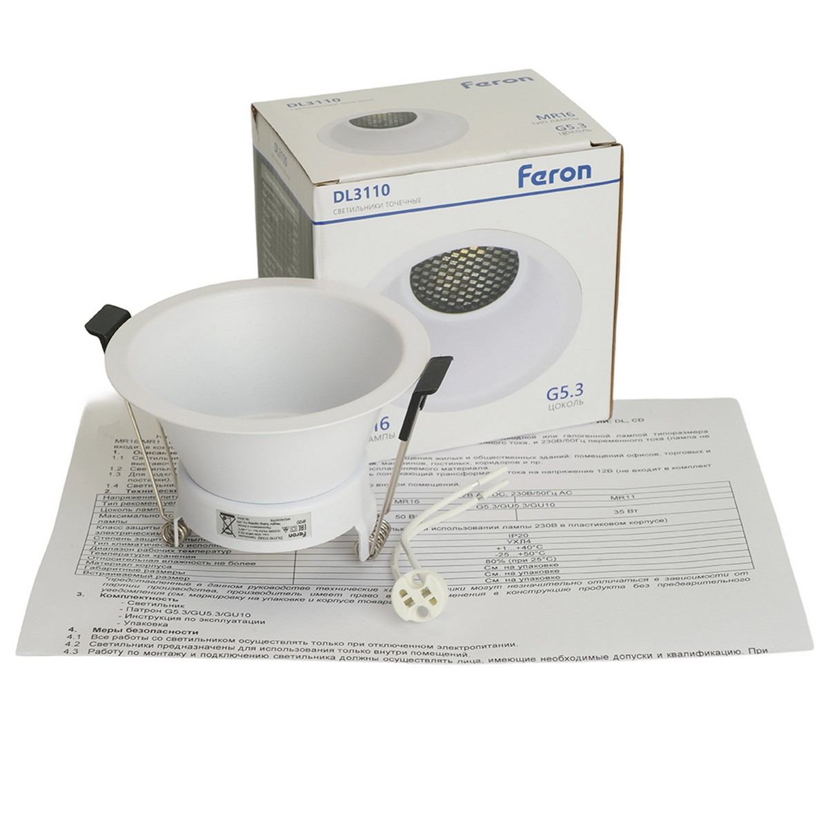 цветовая температура зависит от выбранной лампы. Светильник потолочный встраиваемый (ИВО) FERON DL3110, под лампу MR16 G5.3, белый, круг, 90*90*64 мм, монтажный диаметр 66мм, корпус металл, неповоротный