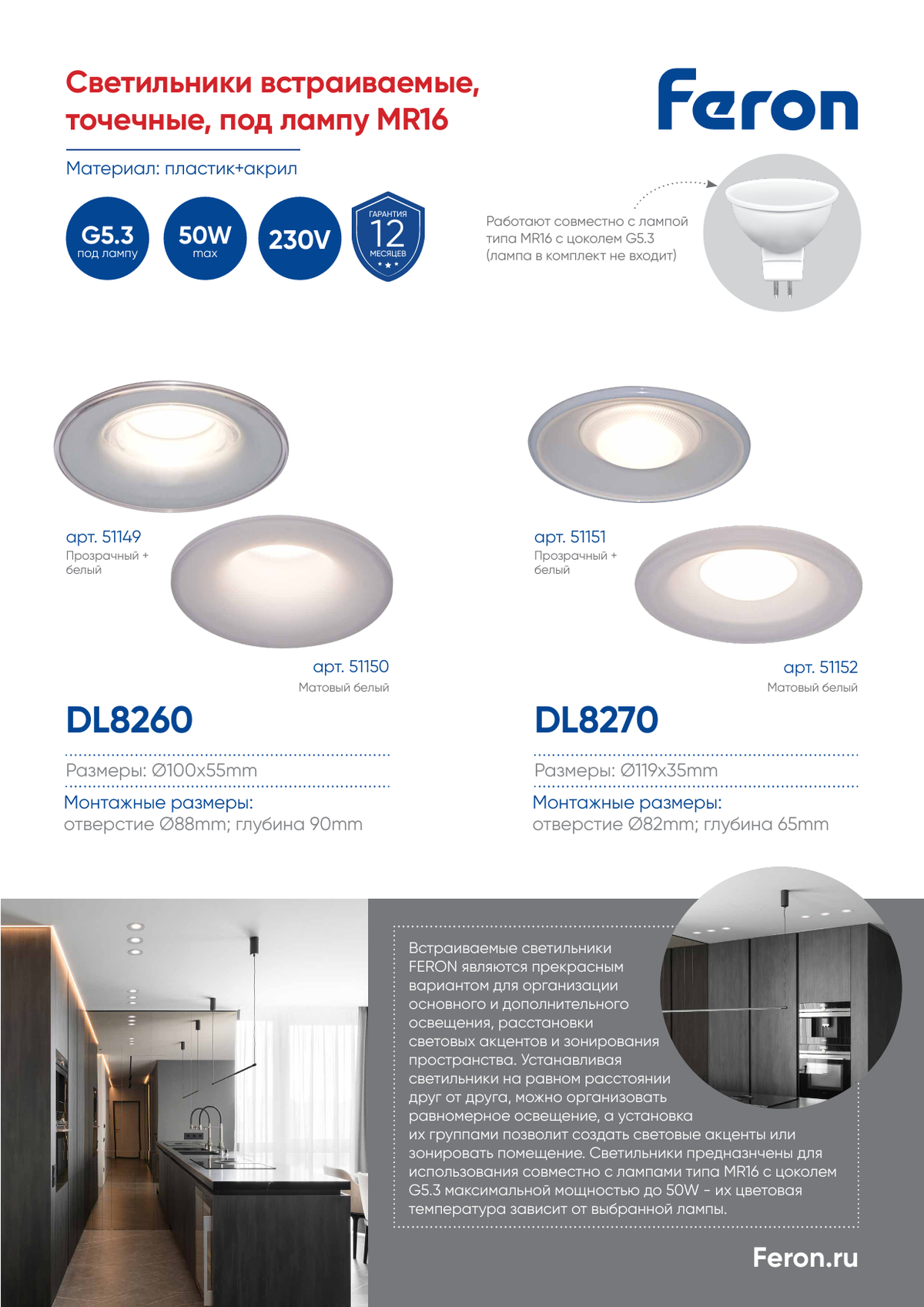 Светильник встраиваемый Feron DL8260 MR16 матовый белый 51150 по цене 437 руб. с фотографией и техническими характеристиками. Для покупки товара нажмите кнопку "Купить" и перейдите в корзину или позвоните по телефону 8 (495) 585 32 60 или 8 (800) 222 23 53.