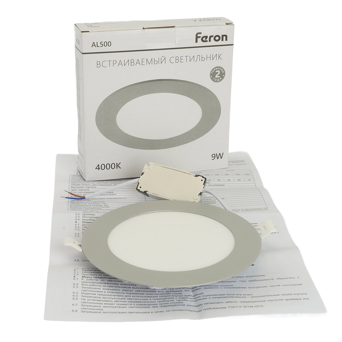 продолжительного срока службы. Светильник встраиваемый светодиодный, ультратонкий (ДВО) FERON AL500, 9W 4000К (белый), 175-265V, 720Lm, IP40, угол рассеивания 120°, цвет серый, корпус алюминий, рассеиватель матовый акриловый полимер, 145*145*18 мм, монтажн.отв. 135*135 мм.