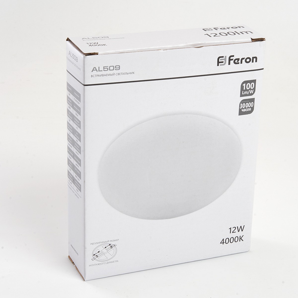 Светильники светодиодные с регулируемым монтажным диаметром, ультратонкий (ДВО) FERON AL509, 12W 4000К (белый), 175-265V, 1200Lm, IP20, угол рассеивания 120°, цвет белый, корпус алюминий, рассеиватель пластик, 120*120*20 мм, монтажн.отв. 40*40 мм.