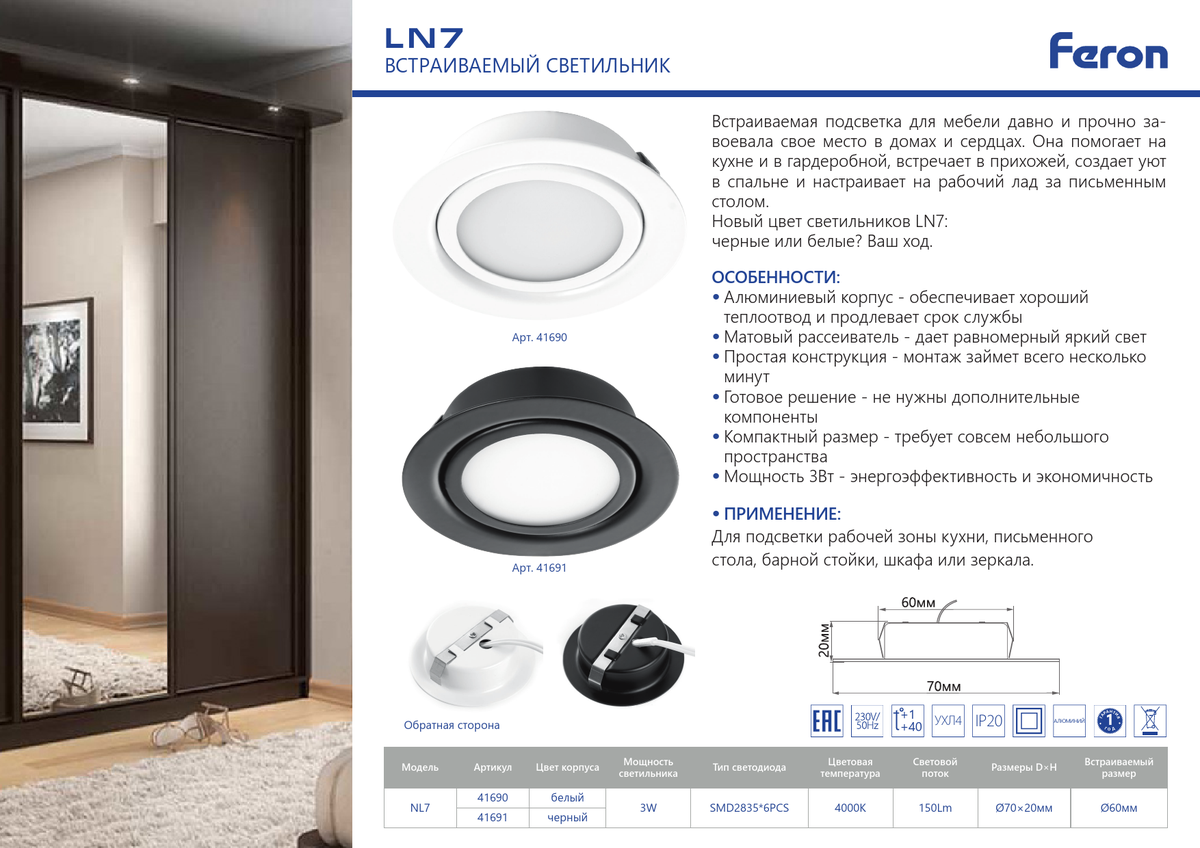 Этот светильник легко монтируется благодаря удобному скрытому механизму, что идеально подходит для натяжных, подвесных или гипсокартонных потолков. Компактные размеры (70x70x20 мм) и диаметр монтажного отверстия (60 мм) облегчают установку. Обладая классом защиты IP20, Feron LN7 подходит для использования внутри помещений, обеспечивая надежную и экономичную работу на напряжении 220V.