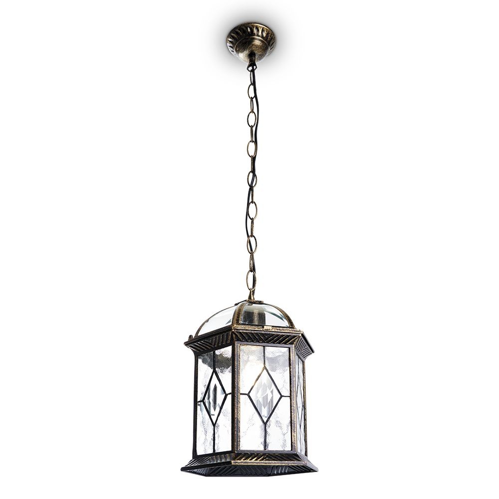 Оформление в элегантном цвете "черное золото" делает этот светильник не только функциональным, но и украшением любого участка, будь то дача, дом или парковая зона. Модель выполнена в оригинальной шестиугольной форме и подвешивается на цепочке, что добавляет изысканности во внешний вид. Размеры светильника составляют 165x165x860 мм, позволяя заметно выделить освещаемое пространство.