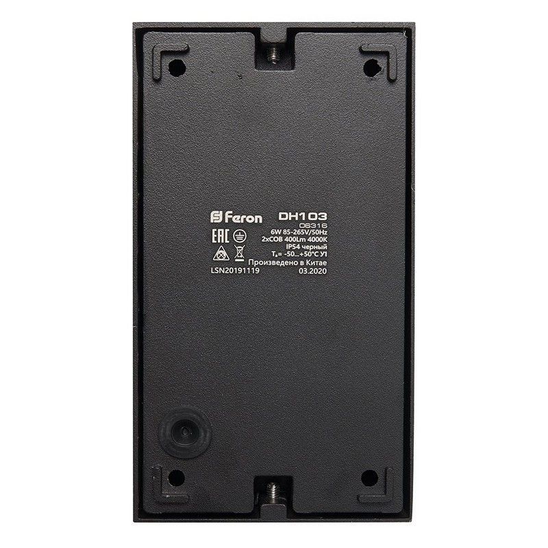 Светильник для уличного освещения. Сделан из металла и стекла, не подвержен коррозии, можно использовать на любых открытых площадках, дачном участке, доме, и других местах. Садово-парковые светильники серии Дели от Feron в цвете Черный с типом цоколя Встроенный светодиод (LED) идеально подойдут для освещения Вашего загородного участка, дачи или дома. Светильник уличный светодиодный, на стену (ДБУ) FERON DH103, серия Дели, 2*3W, 4000К (белый натуральный), 230V/50Гц, 400Lm, IP54, 2LED*COB, класс защиты 1, раб.t -40°C...+40°C, цвет черный, корпус алюминий, 63*80*142мм,