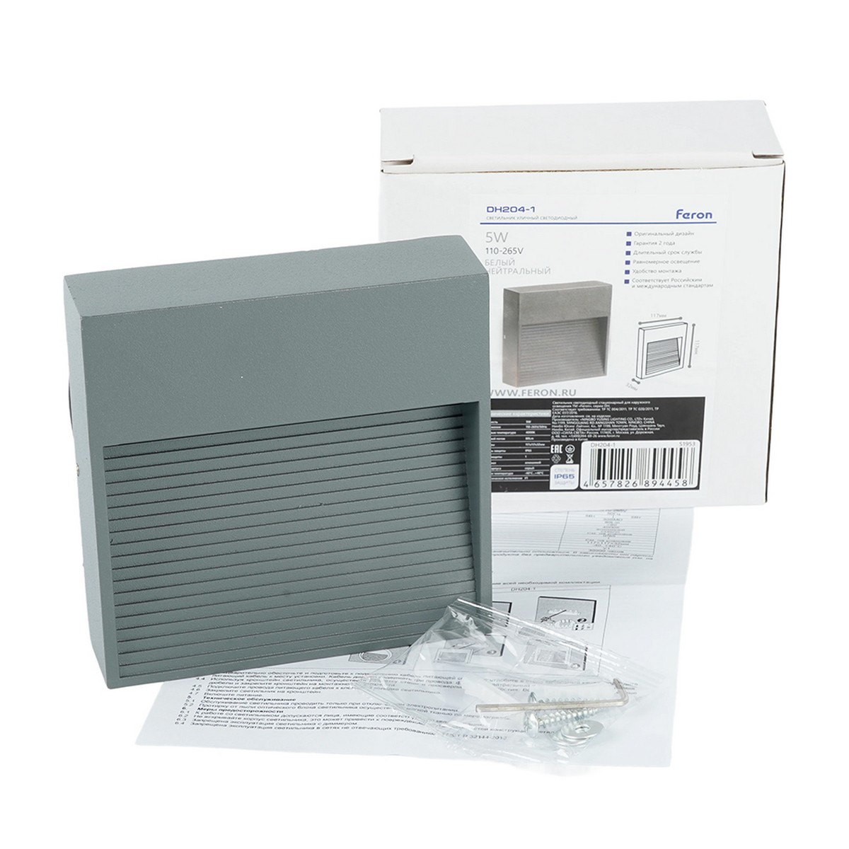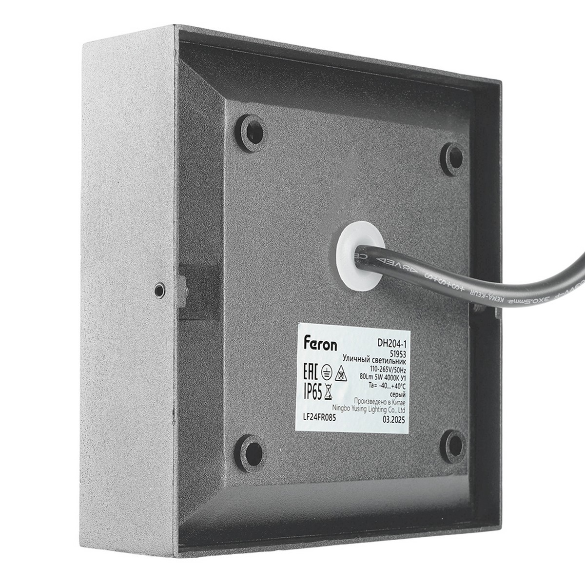 Светильник уличный светодиодный, накладной (ДБУ) FERON DH204-1, серия Чикаго, 5W, 4000К (белый натуральный), 110-265V/50Гц, 80Lm, IP65, 30LED*SMD, класс защиты 1, раб.t -40°C...+40°C, цвет серый, корпус алюминий, 117*117*32мм,