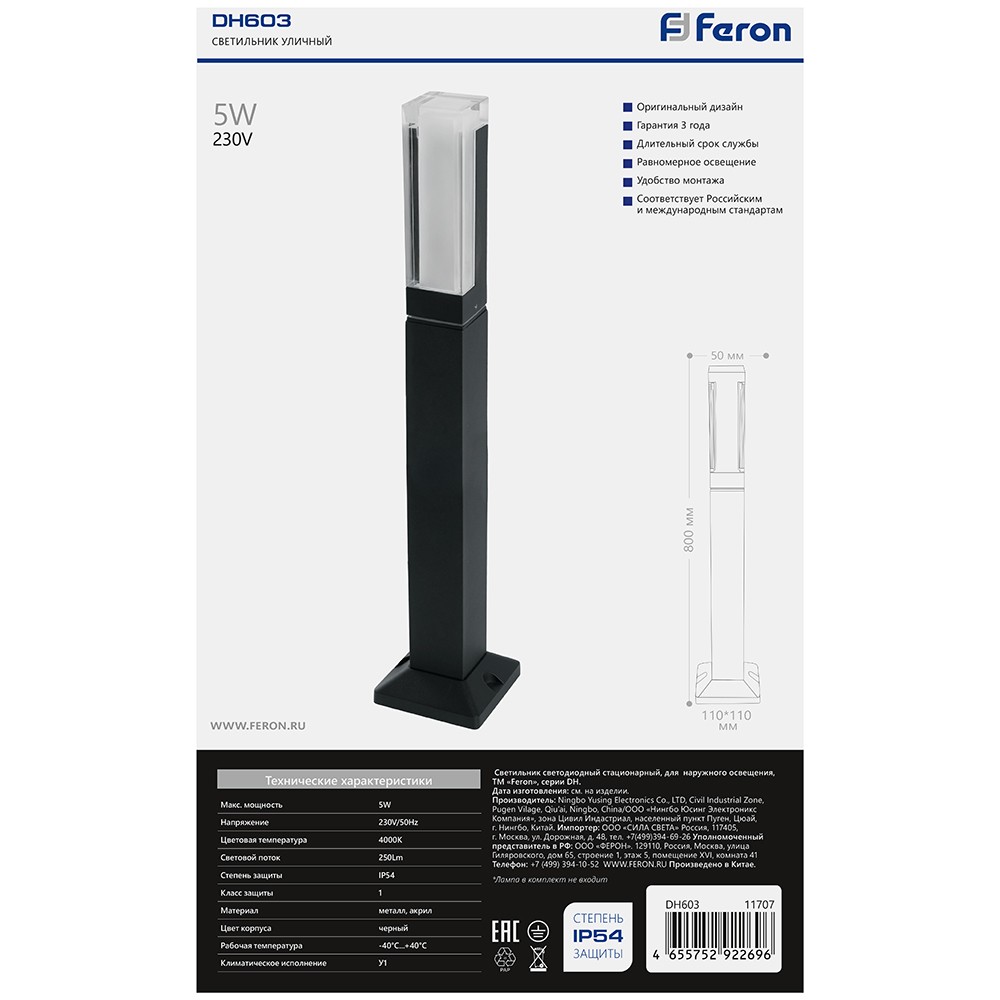 Светильник уличный светодиодный Feron DH603 – идеальное решение для освещения вашего загородного участка или дачи. Модель с мощностью 5 Вт и световым потоком 250 Лм обеспечивает яркое и естественное освещение с цветовой температурой 4000K, создавая комфортную атмосферу. Корпус светильника выполнен из прочного алюминия и стекла, что обеспечивает высокую стойкость к коррозии и внешним воздействиям. Степень защиты IP54 позволяет использовать его в любых погодных условиях, что делает Feron DH603 надежным выбором для улицы. Габариты 50*50*800 мм позволяют без труда интегрировать светильник в ландшафтный дизайн. С встроенным LED-источником света и классом защиты 1, этот светильник гарантирует безопасность и долговечность. Обновите освещение вашего участка с Feron DH603, который станет стильным и функциональным элементом вашего внешнего пространства.