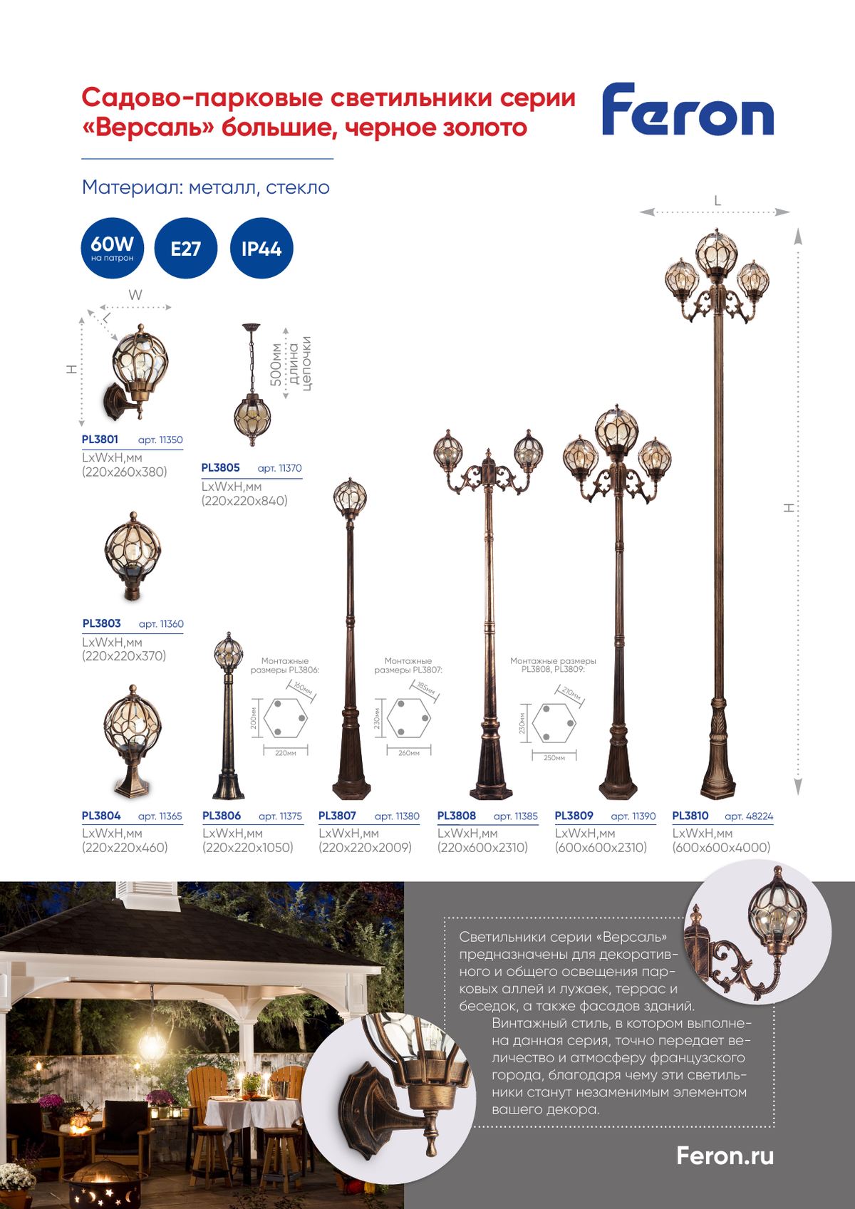 Высота столба 2310 мм, ширина – 220 мм, позволяет разместить светильник в любом подходящем месте вашего двора или сада. Элегантный дизайн в серии «Версаль» украсит ландшафт и создаст приятную атмосферу. Помимо функциональности, Feron PL3808 станет частью ландшафтного дизайна, подчеркивая стиль вашего пространства.