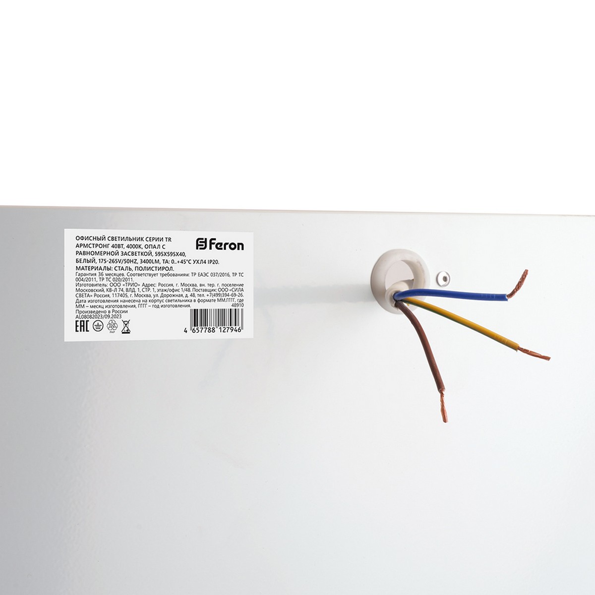Офисный светильник серии TR Армстронг 40Вт 4000К опал (артикул 48910) от производителя Feron — это идеальное решение для оформления освещения в офисах и коммерческих помещениях. Этот встраиваемый светильник обеспечивает равномерное распределение света благодаря углу рассеивания в 120°, создавая комфортную атмосферу для работы. С мощностью 40Вт и световым потоком 3400 люмен, он обеспечивает яркое нейтральное белое освещение (4000K), которое соответствует современным требованиям освещения. Сделанный из стали с полистирольным рассеивателем, он не только прочен, но и элегантно вписывается в любой интерьер. Размеры светильника составляют 595x595x40 мм, что идеально подходит для потолков типа Армстронг. Простота установки (встраиваемый или накладной монтаж) и надежность делают TR Армстронг универсальным выбором для любых условий!