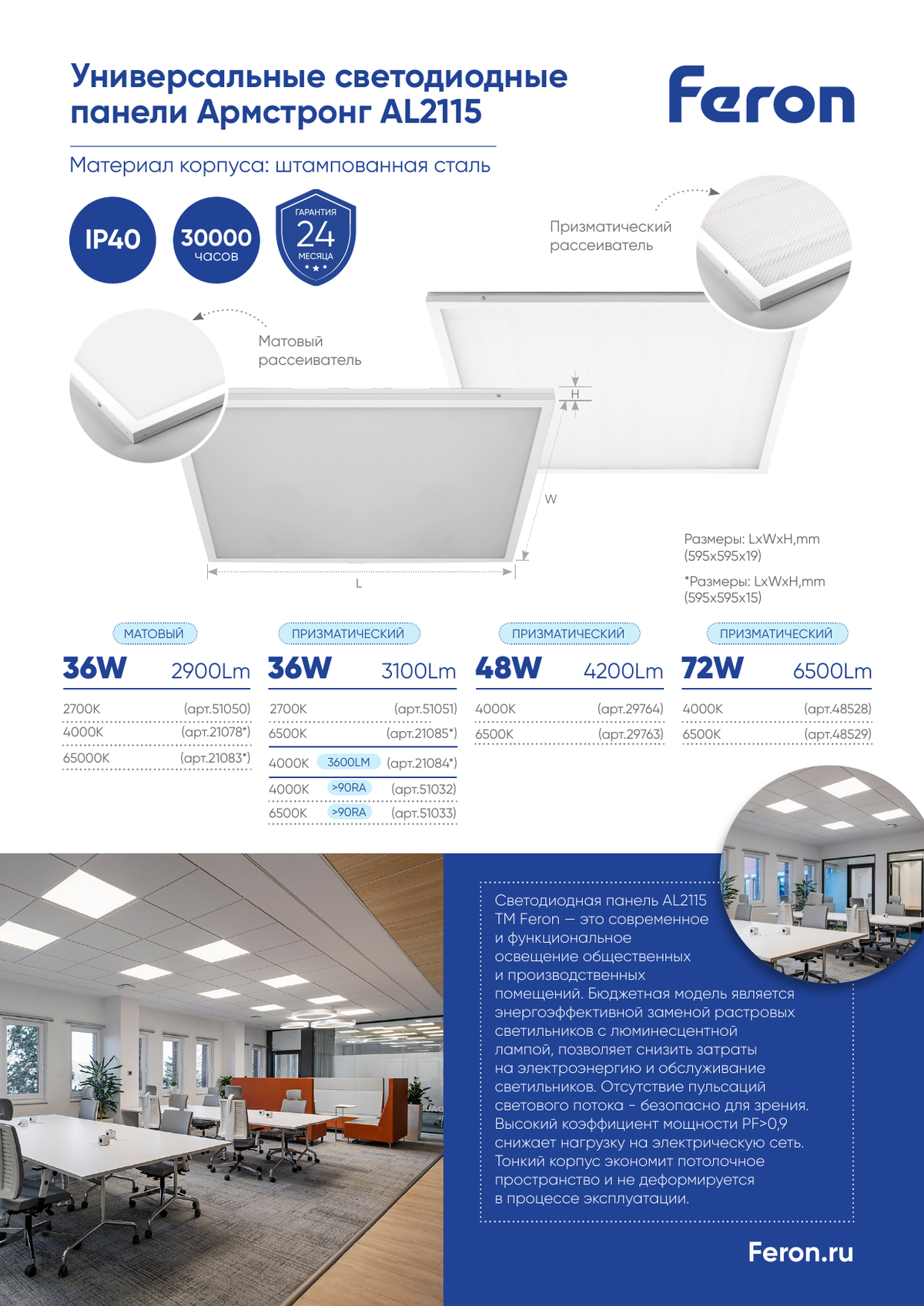 Светодиодные светильники армстронг 600*600 Светодиодный светильник Feron AL2115 встраиваемый 72W 6500K белый  48529